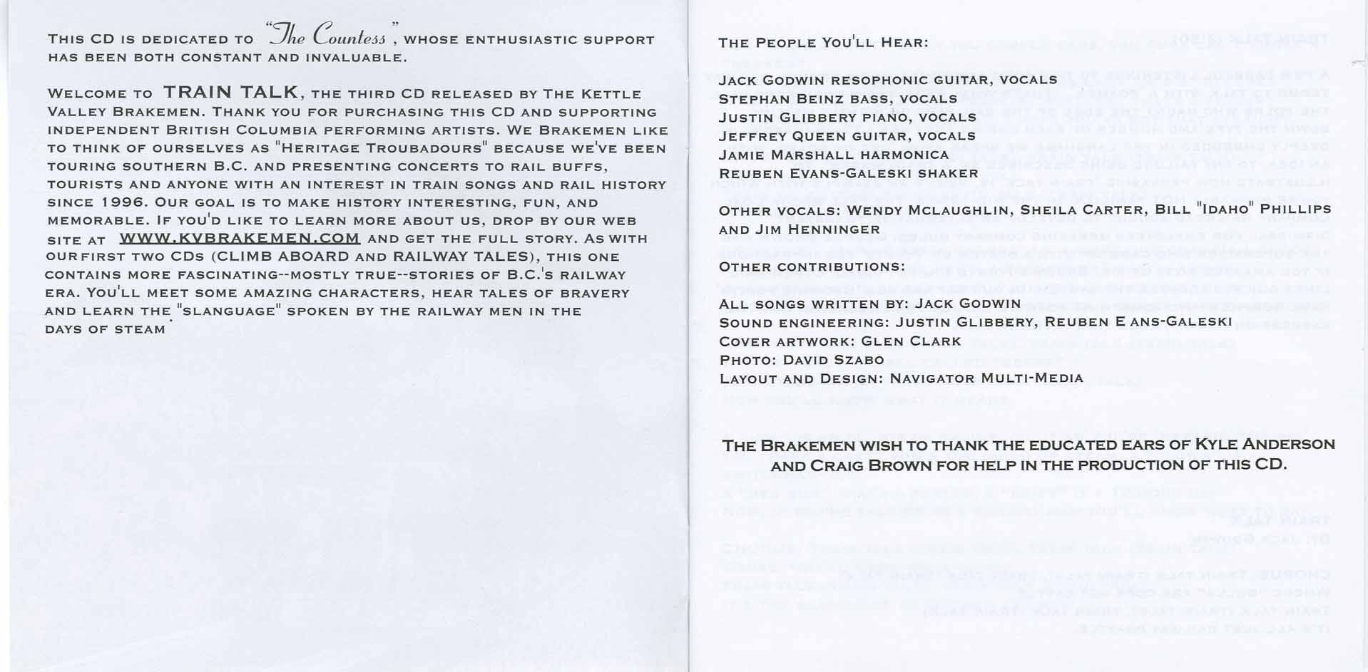 In his second career as chief engineer of the folksy, bluegrass Kettle Valley Brakemen, he uses the same technique, drawing audiences into the performance with tales from the railway days, stories about how he came to write the songs and lots of humour. Every concert is a rollicking history lesson with special emphasis on the Kettle Valley line.