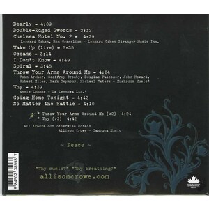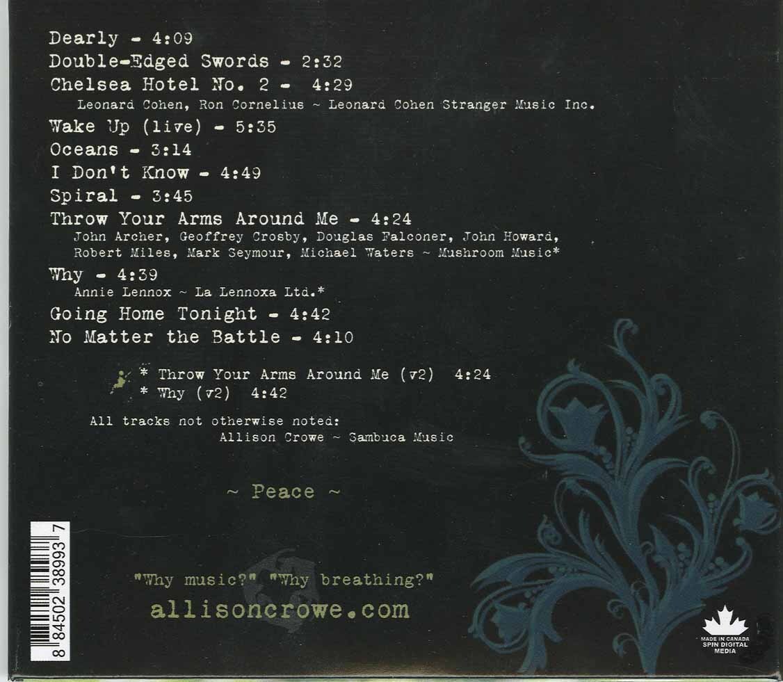 Spiral ♫ contains eight of Allison Crowe’s original songs, ranging from the tender and playful country/roots of “Dearly”, to the upbeat pop of “Double-Edged Swords”, ’cross the loving “Oceans”, and darker terrain of “I Don’t Know” and the hard rocking title track. Raw, natural, emotion is embraced passionately with elegiac beauty and melody in these, and such joy-filled tunes as “Going Home Tonight” and “No Matter the Battle”. With the live track, “Wake Up”, Crowe, again, renders the personal universal, and the global, human.