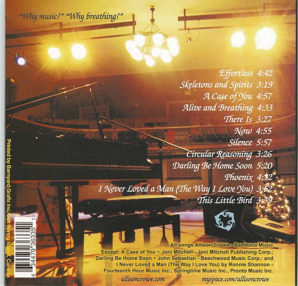 This Little Bird contains everything to love about the music of Allison Crowe. Adding titles of engineer and producer to her vocal, piano and guitar credits, Crowe is joined on most of the album's tracks by an ideal rhythm section ~ Dave Baird (bass) and Laurent Boucher (percussion). Nine new originals map emotional and spiritual territory with fresh sounds, encompassing: the elegiac "Phoenix"; the ramble tamble "Alive and Breathing"; gorgeous songs of love and hope, "Effortless" and "There Is"; the jaunty dark humor of "Skeletons and Spirits"; the redemptive grace of "Now"; the raucous celebration of the title track; a joy of simplicity in "Circular Reasoning"; and "Silence", a song that stirs with gypsy romance.