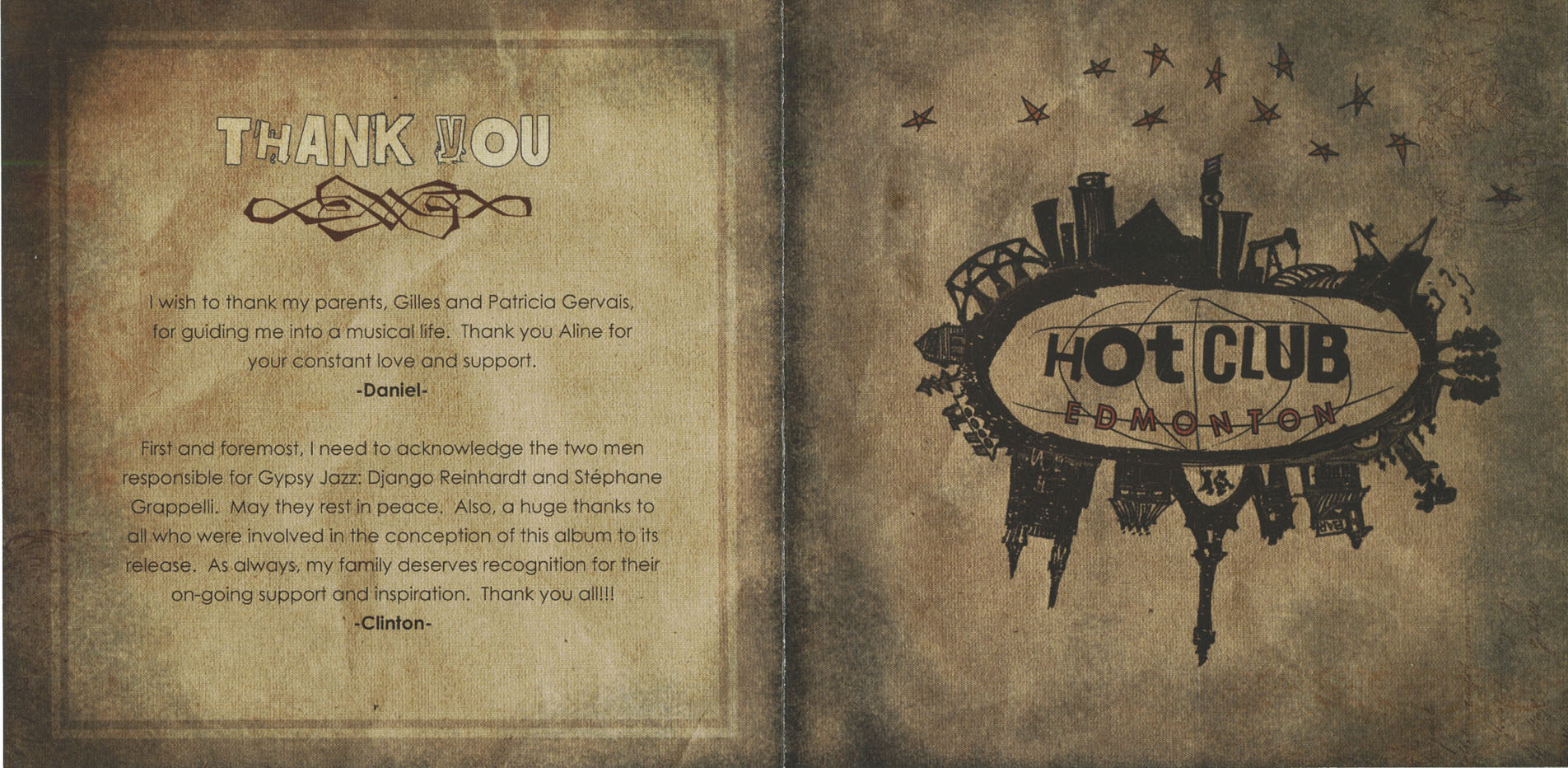 Although Clinton and Daniel are not Gypsies themselves, there are certain parallels between their world and that of Django's and Stéphane's. Firstly, they both have French heritage. Secondly, like the Gypsy peoples, their lives as professional musicians include a lot of travelling. Finally, having grown up listening to Country and Western Swing, they were exposed to and developed an appreciation for improvisation at an early age. Just as Gypsy Jazz was shaped within the context of Paris in the 1930s, the Hot Club Edmonton sound could be described as a product of Gypsy Jazz combined with Western Canadian musical influences.
