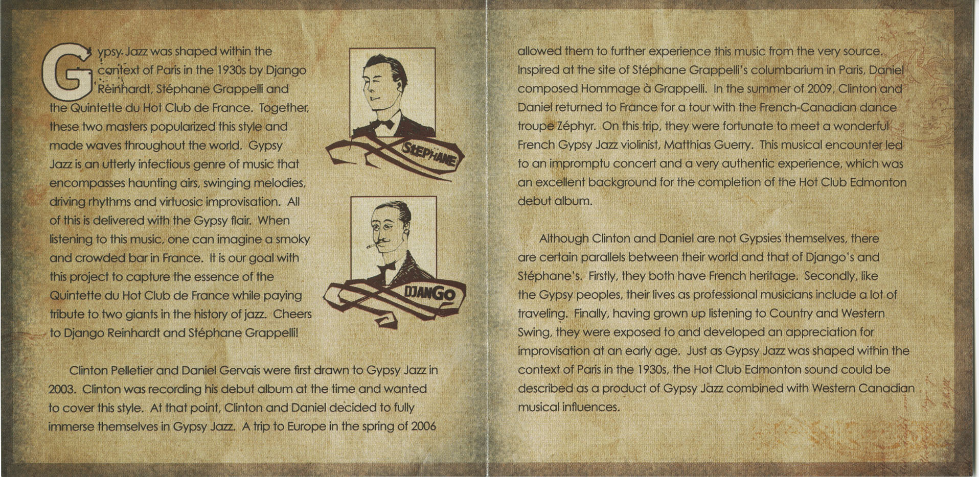 Clinton Pelletier and Daniel Gervais were first drawn to Gypsy Jazz in 2003. Clinton was recording his debut album at the time and wanted to cover this style. At that point, Clinton and Daniel decided to fully immerse themselves in Gypsy Jazz. A trip to Europe in the spring of 2006 allowed them to further experience this music from the very source. Inspired at the site of Stéphane Grappelli's columbarium in Paris, Daniel composed Hommage à Grappelli. In the summer of 2009, Clinton and Daniel returned to France for a tour with the French-Canadian dance troupe Zéphyr. On this trip, they were fortunate to meet a wonderful French Gypsy Jazz violinist, Matthias Guerry. This musical encounter led to an impromptu concert and a very authentic experience, which was an excellent background for the completion of the Hot Club Edmonton debut album.