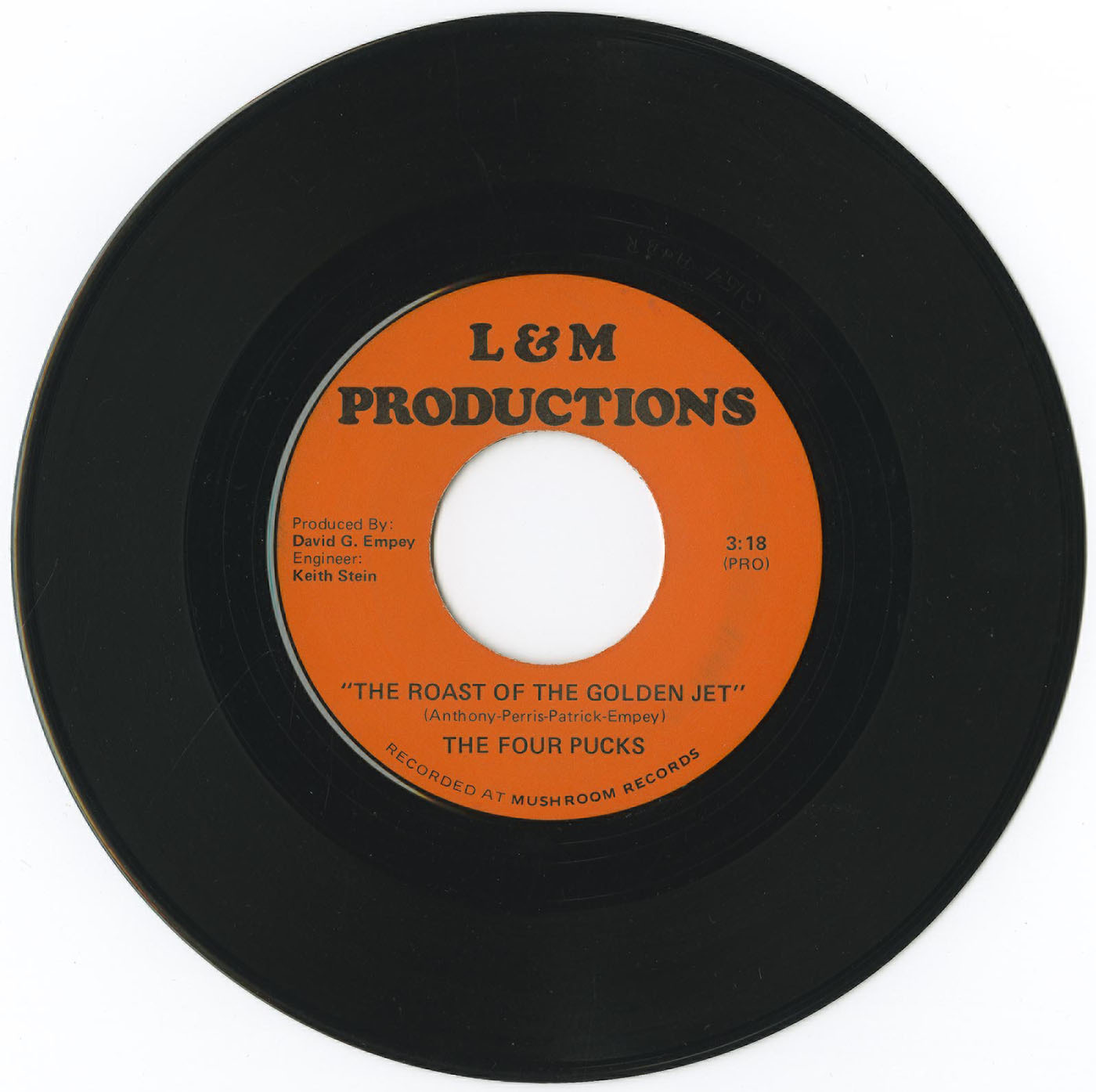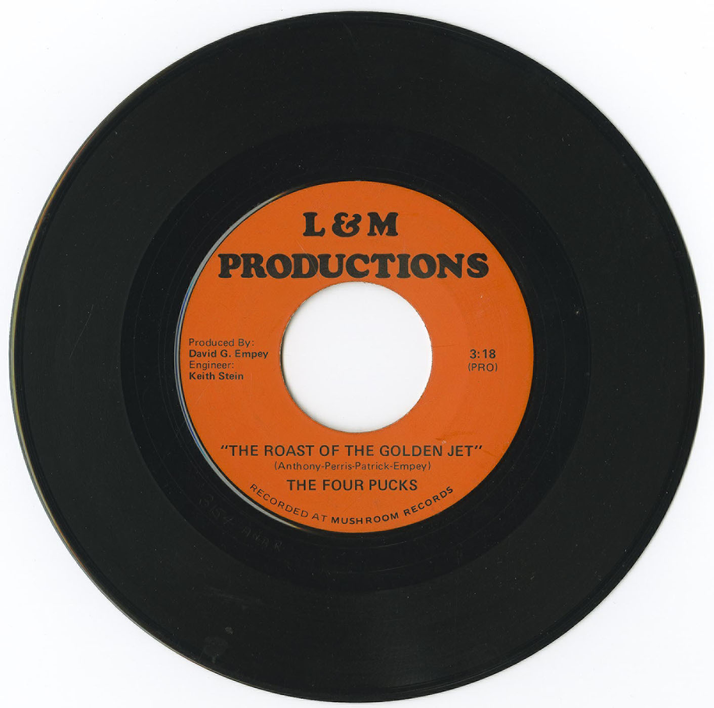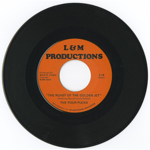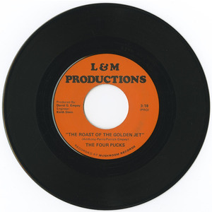 A very rare and special 45 rpm vinyl recording by a group named "The Four Pucks". This record, recorded at Mushroom Records of Vancouver by L & M Productions, in a bubblegum pop style, is about the Bobby Hull, "The Golden Jet" aka "The Blond Flash". Hull was the first player to be awarded a $million dollar contract when he signed a contract with the Winnipeg Jets of the WHA. His defection gave the league instant credibility.