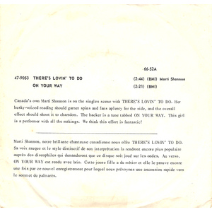 Canada’s own Marti Shannon is on the singles scene with There's Lovin' to Do. Her husky-voiced reading should garner spins and fans aplenty for the side, and the overall effect should shoot it to chartdom. The backer is a tune tabbed On Your Way. This girl is a performer with all the makings. We think this effort is fantastic!