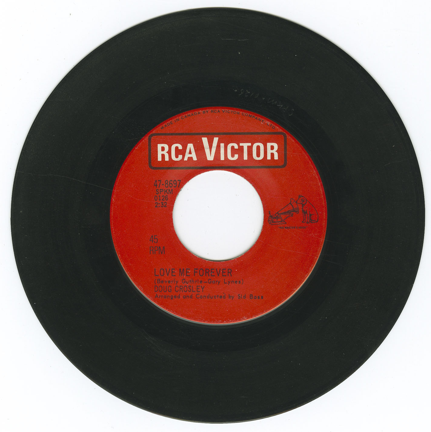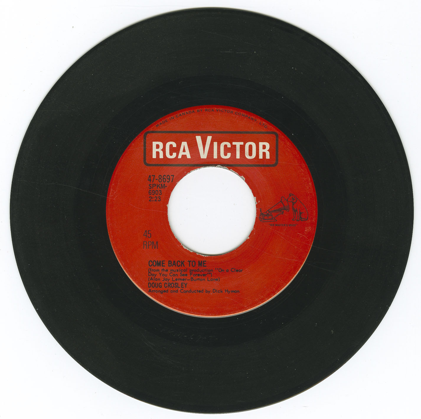 Doug Crosley offers his second single outing – a song from the forthcoming Broadway production of "On A Clear Day You Can See Forever", the much anticipated new show by Alan Jay Lerner and Burton Lane. The side is COME BACK TO ME, a rhythmic, up-tempo ballad with full orchestra and chorus backing, that Doug handles with ease. It should have no trouble picking up air play. The underlid is the familiar LOVE ME FOREVER. Nice going for this young Canadian.