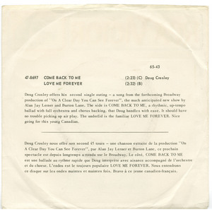 Doug Crosley nous offre son second 45 tours – une chanson extraite de la production "On A Clear Day You Can See Forever", par Alan Jay Lerner et Burton Lane, ce prochain spectacle est depuis longtemps attendu sur le Broadway. Le côté, COME BACK TO ME est une ballade au rythme rapide que Doug interprète avec aisance accompagné de l'orchestre et du choeur. L’endos est le toujours populaire LOVE ME FOREVER. Nous entendrons ce disque sur les ondes maintes et maintes fois. Bravo à ce jeune canadien-français.