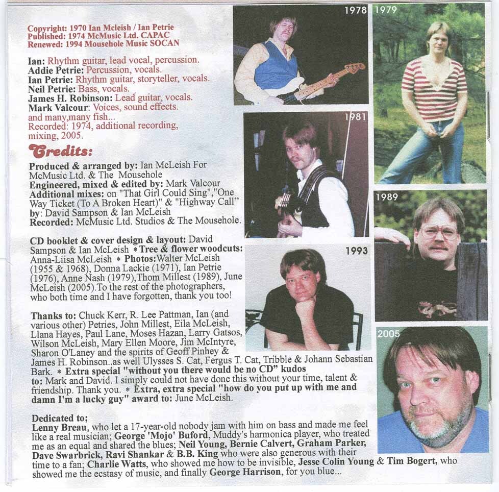 Those songs sat in drawers and on cassettes and reel-to-reel tapes, mostly unheard for years, until now. Some recordings, which date back to the 70's, I decided to use as I felt they had the "feel" or soul of the song, regardless of small errors. In most cases the original track was supplemented with new bass, second guitar and/or vocal to enhance the original demo and make it listenable.