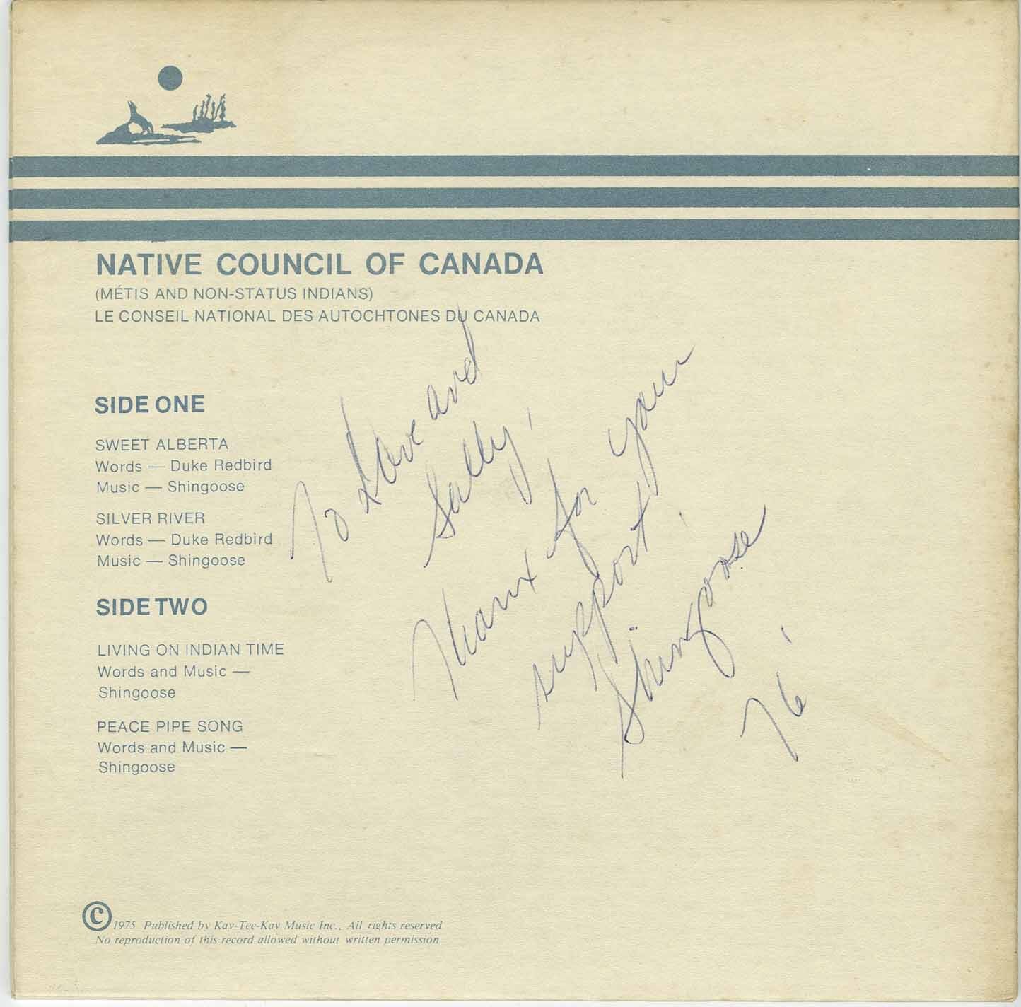 Shingoose's recordings include the EP Native Country (1975, released by the Native Council of Canada, MS-11710-11), the LP Ballad of Norval (1979, CBC LM-467), and the cassette Natural Tan (1989, Headband Records HC-8801). His best-known songs include 'Loved Ones' (originally 'Wounded Knee Blues'), 'Indian Time,' 'Natural Tan,' 'Reservation Blues,' 'Crow Fair,' and 'Elijah'.