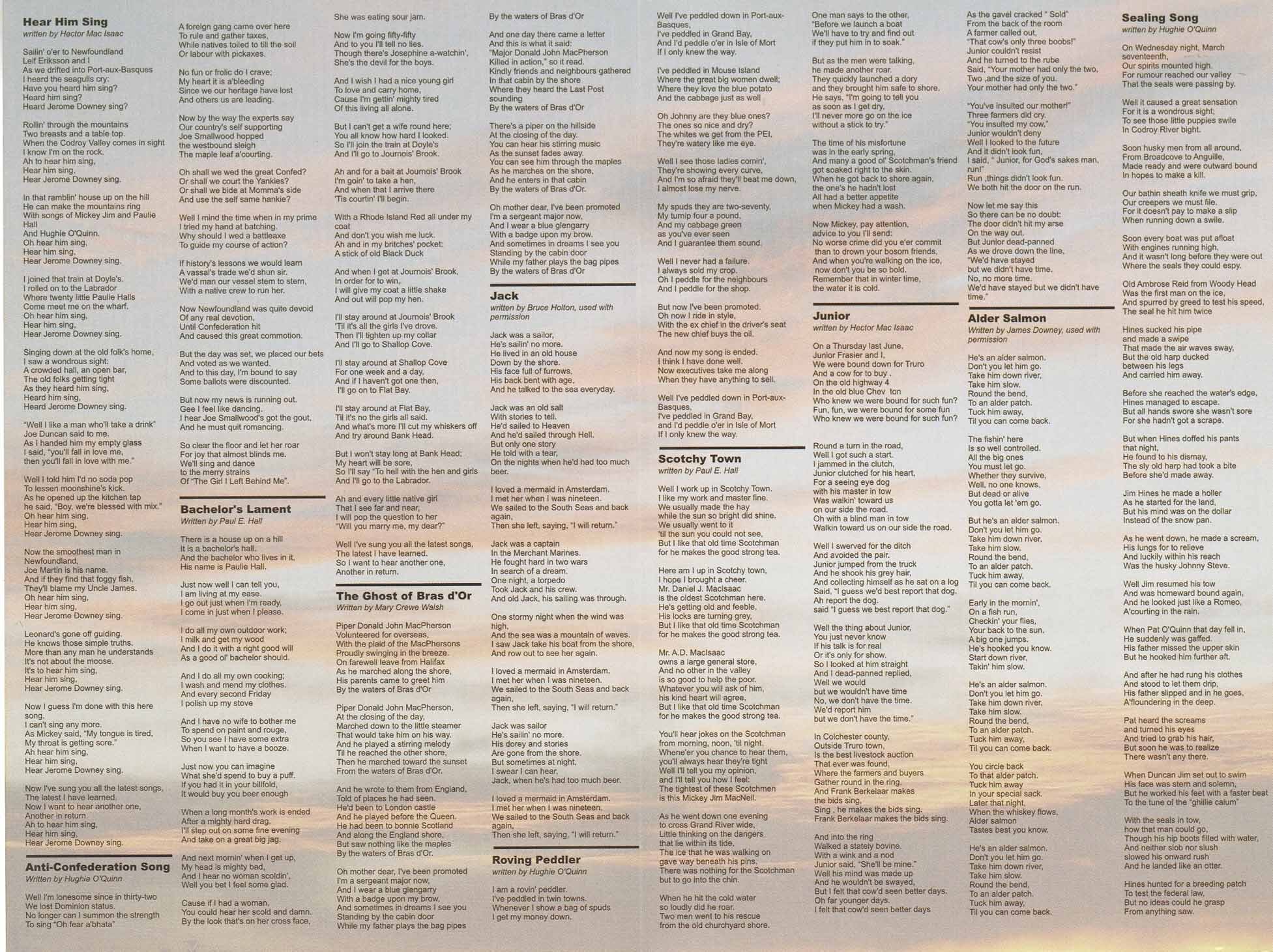 The songs remind one of Newfoundland before Confederation in 1949. As Hector MacIsaac explains it, the Valley, settled by Scots from Inverness who were drawn there because there were no property taxes, were just about unanimous in not only voting against Confederation with Canada but to this day believe that the Premier, Joey Smallwood, somehow rigged the vote. But the songs also remind the listener of the tough conditions in Newfoundland’s out ports, such as one on sealing in March. Seals were an essential part of the diet in the spring when, after a long winter, the pork barrel was nearly empty and the people faced hunger.