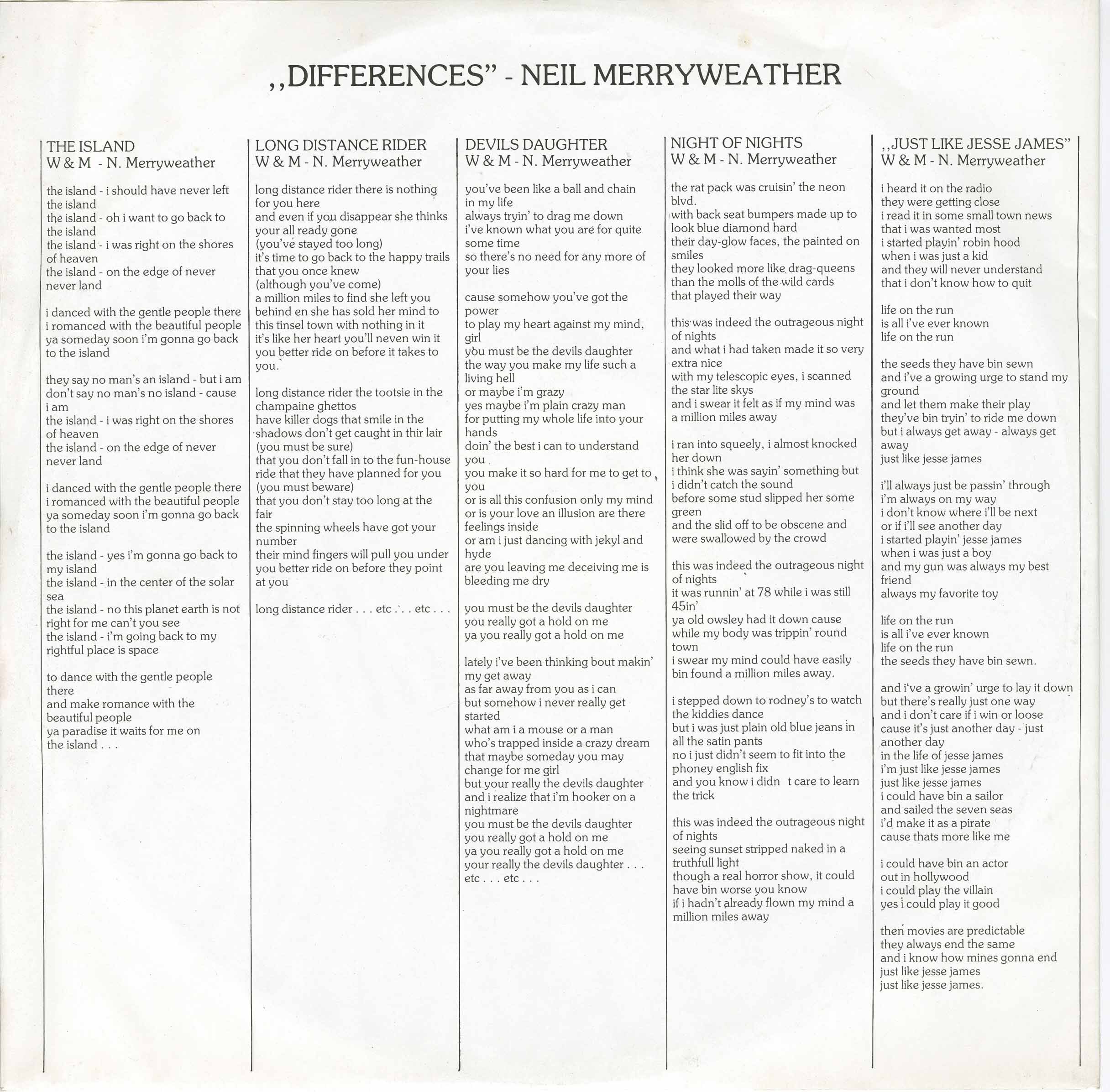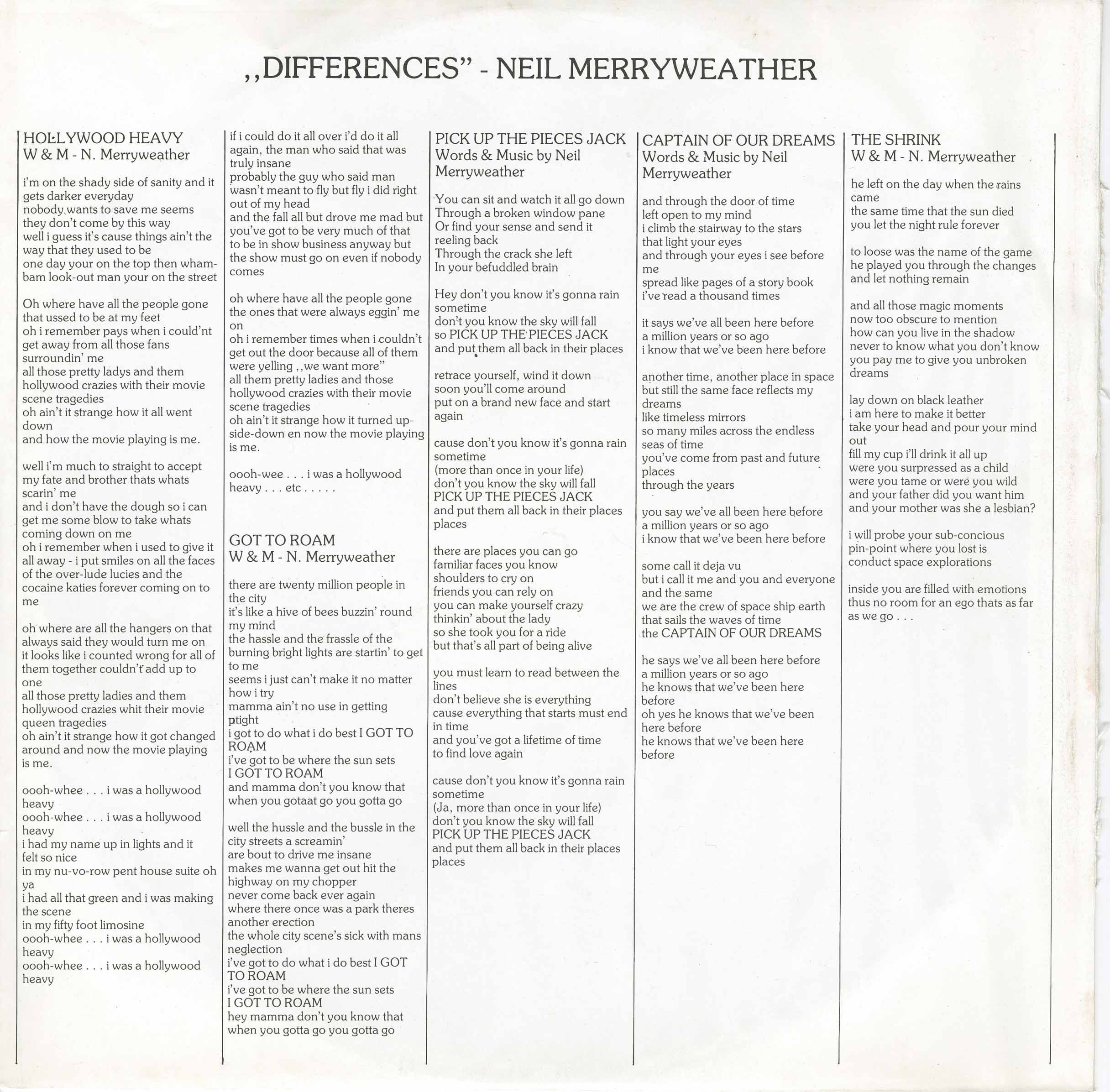 Neil met Mark Smith, a fellow Canadian from Toronto who had engineered the “Bachman Turner Overdrive” records. Mark brought Neil to Joe Godfried, the manager and owner of Sound City Recording Studios, and he agreed to give studio time to Neil. Neil wrote ten songs and brought in a crew of friends to play on the tracks including Michael Willis, his guitarist from the “Space Rangers”. The songs came from different places musically, so Neil called the collection “Differences”. Neil went to England where the songs earned him a writer’s contract with Chrysalis Music. Through a connection with Chrysalis, Dureco Records Holland releases “Differences”.