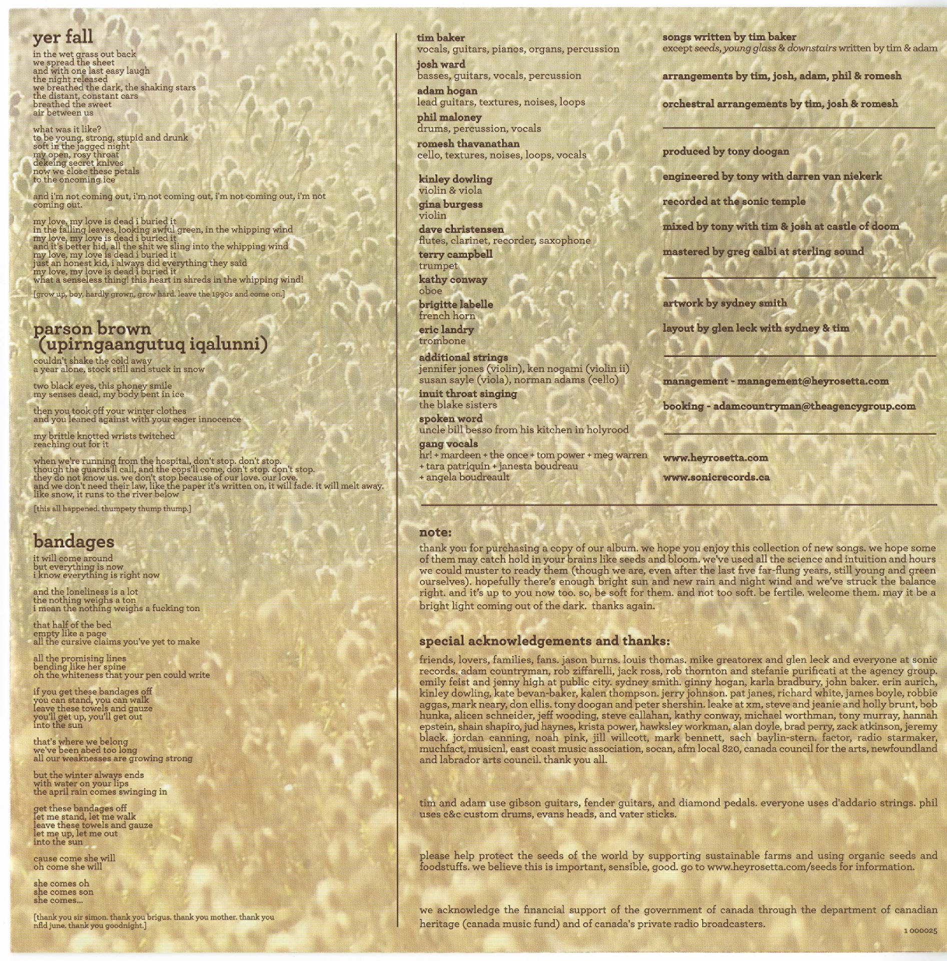 Hey Rosetta! have always had a flair for the dramatic, and the Newfoundland six-piece sound as epic as ever on third LP Seeds. The group recruited additional string players for the recording sessions, layering these contributions repeatedly to create a faux-orchestra. The lush strings give extra heft to the group's cinematic folk rock songs, which contain everything from skanking reggae grooves ("New Sum") to Inuit throat singing ("Parson Brown") to booty-shaking, Afro-rock breakdowns ("Yer Spring"). On the cinematic "Yer Fall," the band follow Arcade Fire's baroque rock blueprint, and the sweeping, group-sung crescendo sounds distinctly similar to "Wake Up." The intricate arrangements are impressive, but the band sound best when they strip things down. Closing track "Bandages" is a gorgeous palate cleanser, relying on little more than strummed acoustic guitar and some sparse accompaniment to convey frontman Tim Baker's heartbreaking message: "The nothing weighs a fucking ton." For Hey Rosetta!, bigger isn't always better.