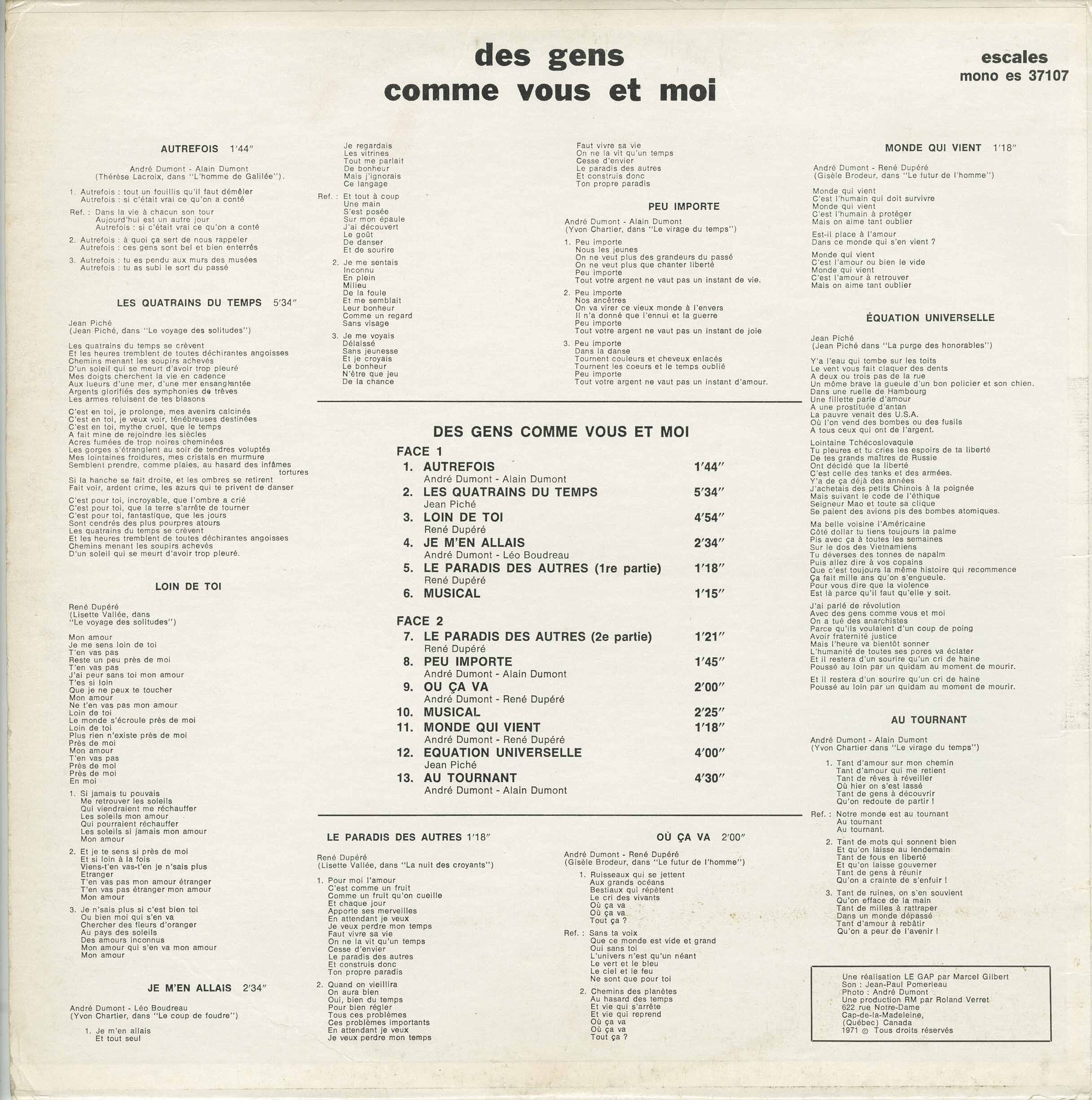 Here is a MEGA RARE private 1971 album from a group of french canadian composers and musicians from the region of Cap-de-la-Madeleine (now Trois-Rivières), province of Quebec, Canada, named "Des gens comme vous et moi". Among these musicians and composers, we find René Dupéré, André Dumont and Jean Piché, (composers on each track of the LP) and future members of the folk psych prog group AGAPE, who will release their album "Le troisième seuil" one year later (1972). Moreover, we can foresee the direction of their music.