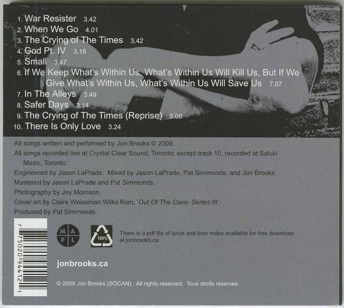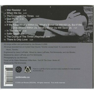 Jon Brooks' latest CD features an ominous title - "Moth Nor Rust" - a phrase taken straight from new testament scripture - and equally ominous artwork entitled "Out of the Cave: Series III". These touchstones point to a serious disc, indeed. But like so many a biblical phrase, there are hints of horror and damage but also hope and joy. Brooks elegantly rails against the injustices of our times, but this is no easy cynical blast of anger. Brooks' music features pretty melodies and soft picking guitar which are set against a gruff gravelly voice and syncopating guitar beats. Black and white, good and evil, love and hate, yin and yang - it's all there. Brooks is clearly a fan of contrast, and this disc does a fantastic job of capturing these elements.