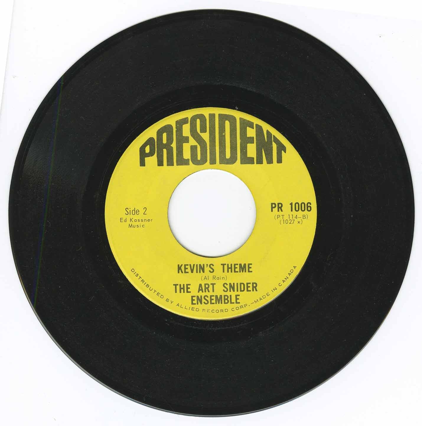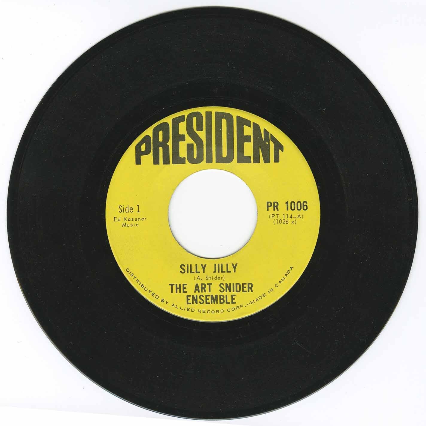This jaunty single "Silly Jilly" b/w "Kevin's Theme" is a piano-oriented record by The Art Snider Ensemble. Snider was born in Ottawa in 1926 and died in Toronto in 1987. He was a pianist, record producer, arranger, and manager. He established and ran Chateau Records from 1956 to 1961. Later, he established and ran Sound Canada from 1967 to 1981, and Periwinkle Records label in 1973. He wrote the A side "Silly Jilly" which is best described as a kind of Pop Ragtime dance tune. Dreams, Fantasies Nightmares notes that "this group climbed to No. 74 in Canada on 17th June 1967 with Silly Jilly."