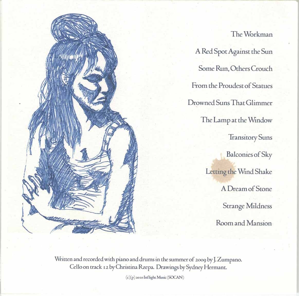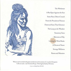 the third of Jason Zumpano’s collaborative projects with a select visual artist, is now available. This time, JZ’s artistic compatriot is Sydney Vermont (Sydney Hermant), who the Destroyer fans around here will recognize aas Dan Bejar’s partner in Hello Blue Roses, and cover artist for Your Blues and Trouble In Dreams. Sydney provided all of the wonderful artwork for this release– including the 2 giclee prints that each copy is packaged with. And of course, JZ himself turned in 12 new instrumental piano compositions, inspired by and accompanying Sydney’s art.
