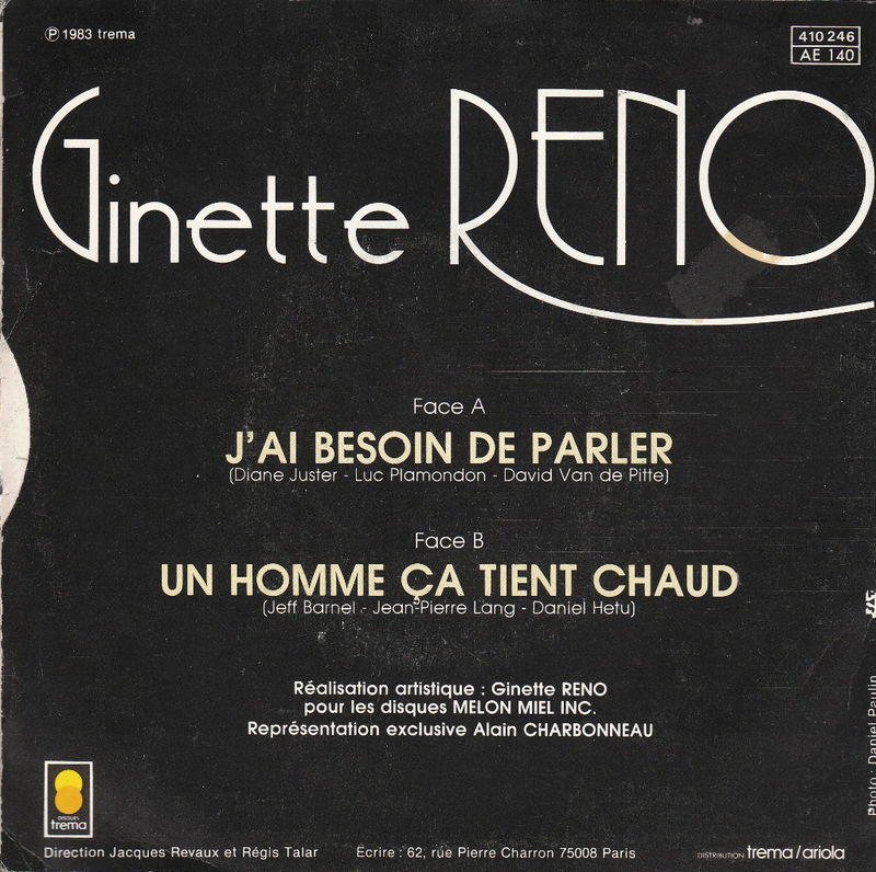 Ginette Reno - J'ai besoin de parler b/w Un homme ca tient chaud (picture sleeve)