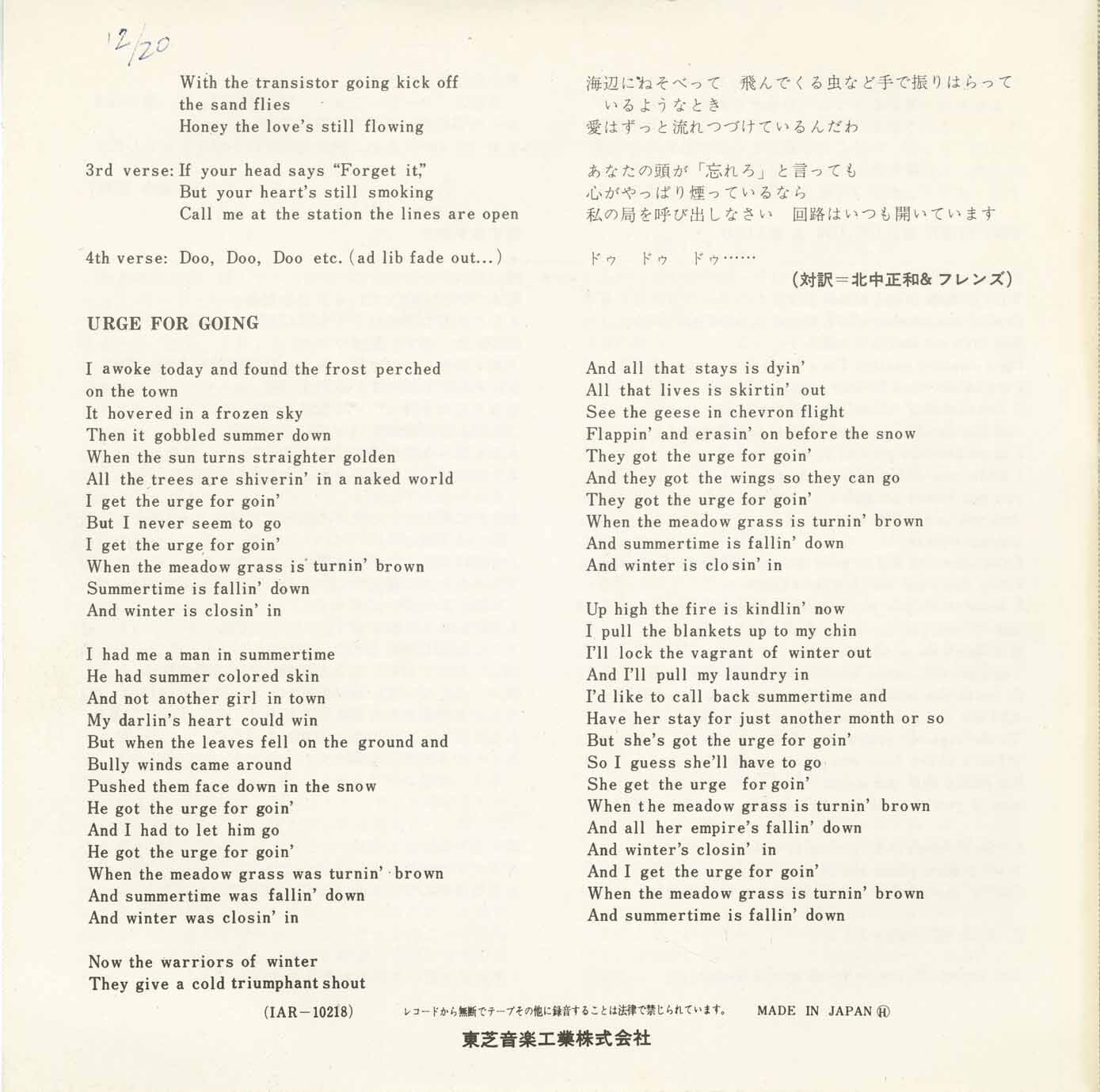 You turn Me On, I'm a Radio b/w Urge for Going (picture sleeve) (promo)
