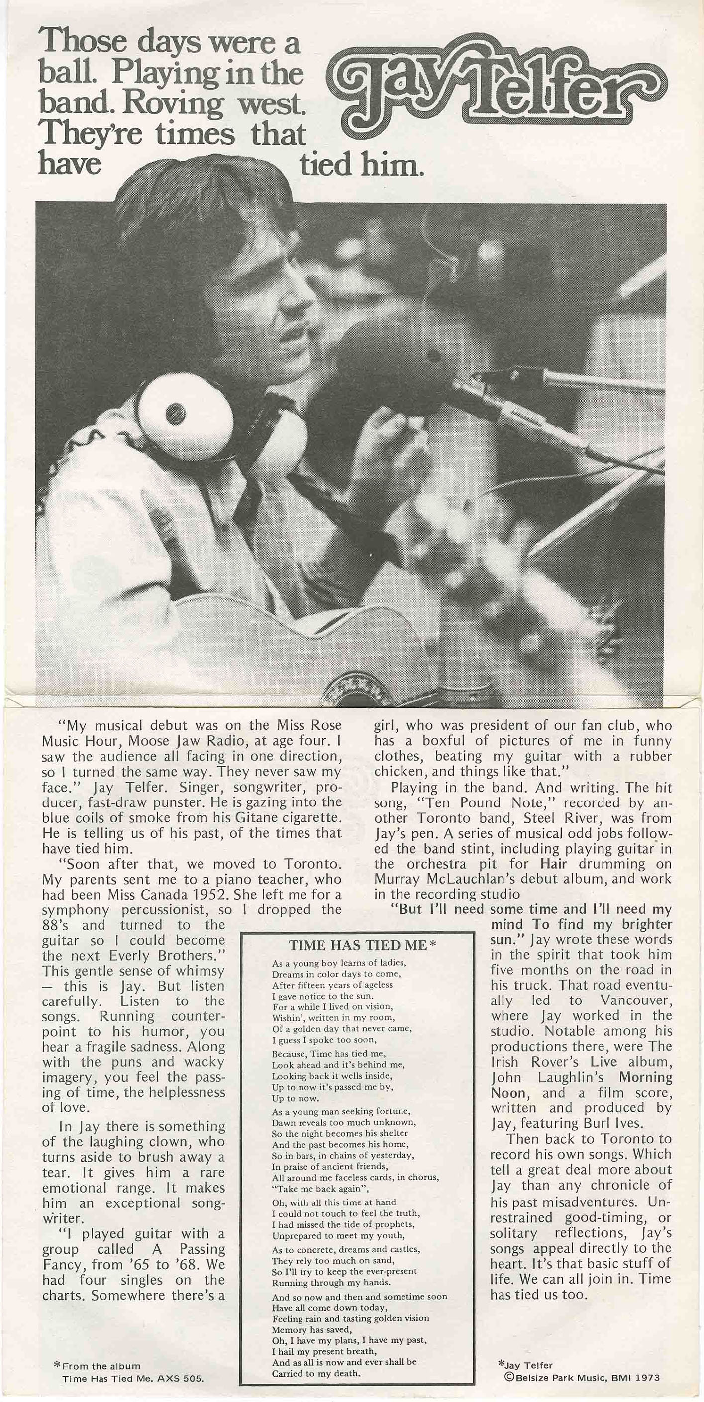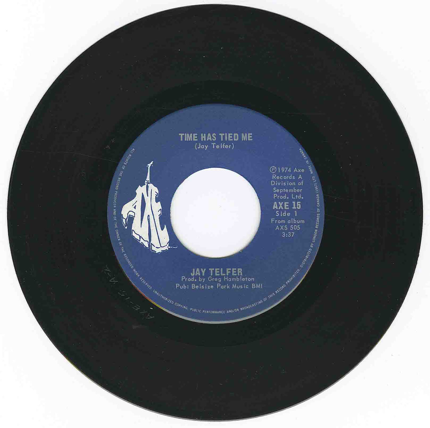 In its November 24, 1973 issue, RPM reported "Greg Hambleton has signed Jay Telfer to Axe Records representing the first new artist to be signed to Axe in almost two years. Jay is now in Toronto Sound laying down album tracks with Greg producing." Telfer's first single for the label, "Time Has Tied Me", entered the RPM Pop Music Playlist at #50 in the issue dated April 20, 1974.