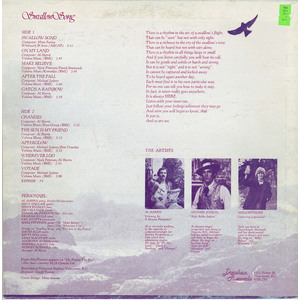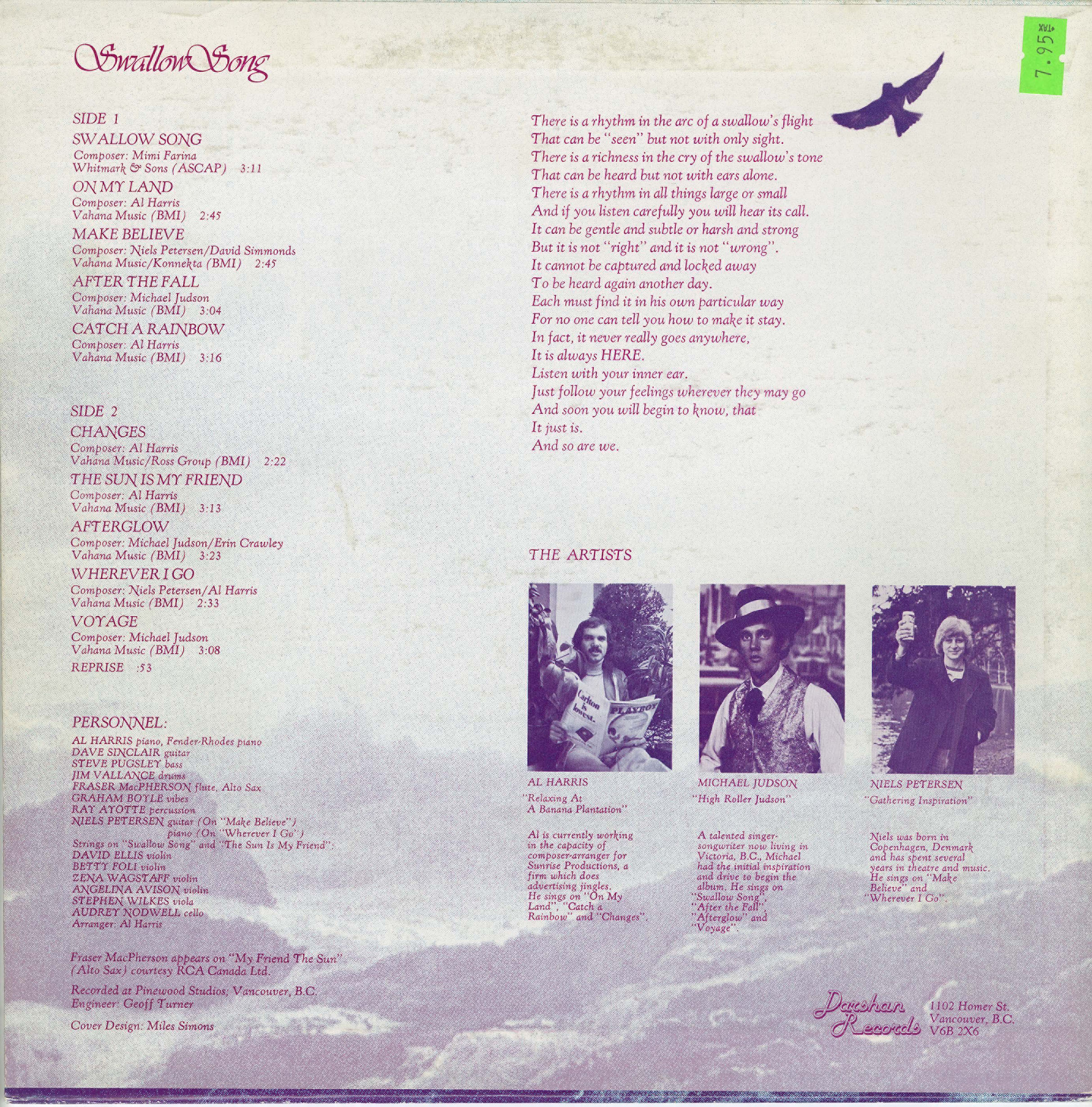 "Al Harris (reading a Playboy, relaxing at a banana plantation) is currently working in the capacity of composer-arranger For Sunrise Productions, a firm which does advertising jingles. He sings on "Swallow Song", "Catch a Rainbow" and "Changes".