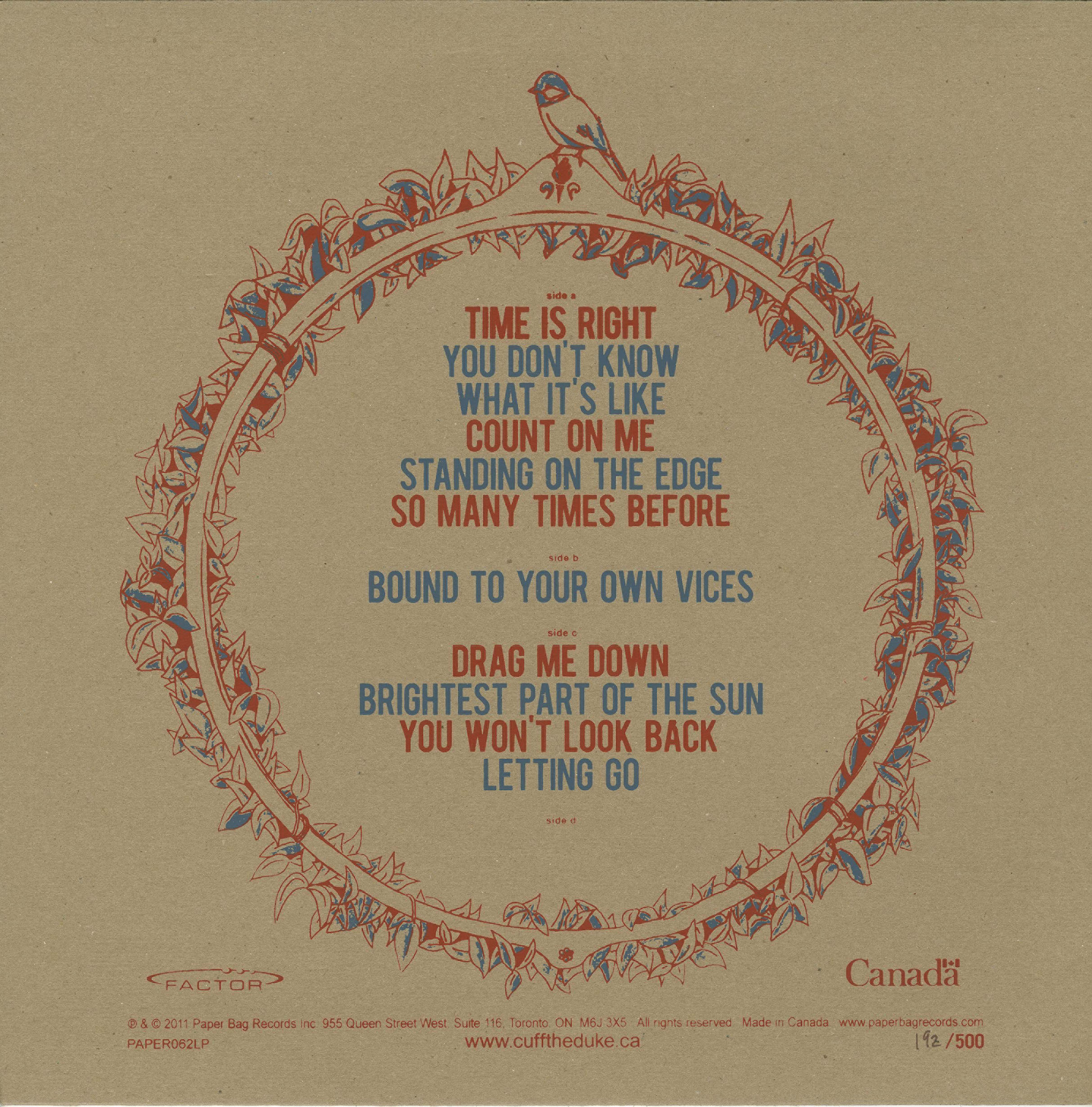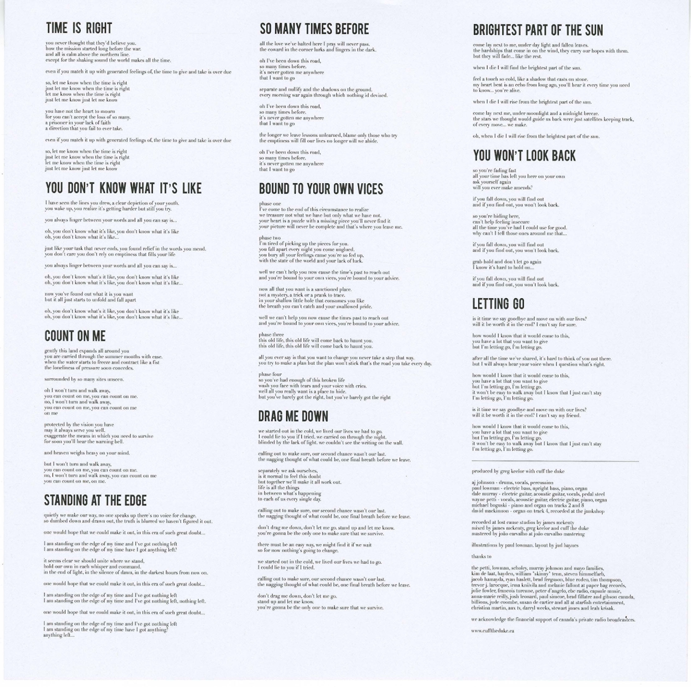 Cuff the Duke re-enlisted Blue Rodeo’s Greg Keelor to co-produce the album (Keelor also co-produced Cuff’s last full-length, 2009′s Way Down Here). While the Blue Rodeo influence is significant in terms of sound, structure, and instrumentation, there is nothing wrong with organs recorded properly and the satisfying crunch of bright guitars. “Time is Right” and “You Don’t Know What It’s Like” sound as polished as a Tom Petty radio single, with easy-to-remember hooks and catchy choruses.