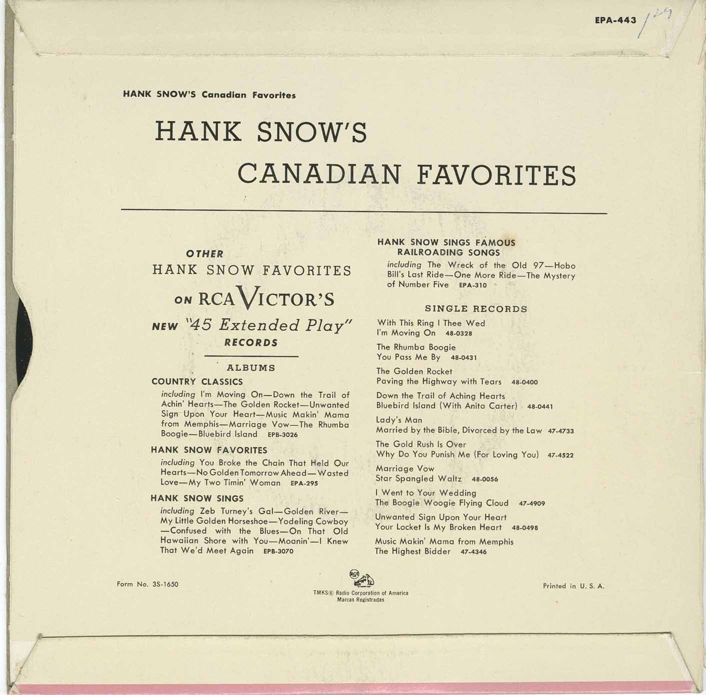 Hank Snow - Canadian Favorites (picture sleeve)