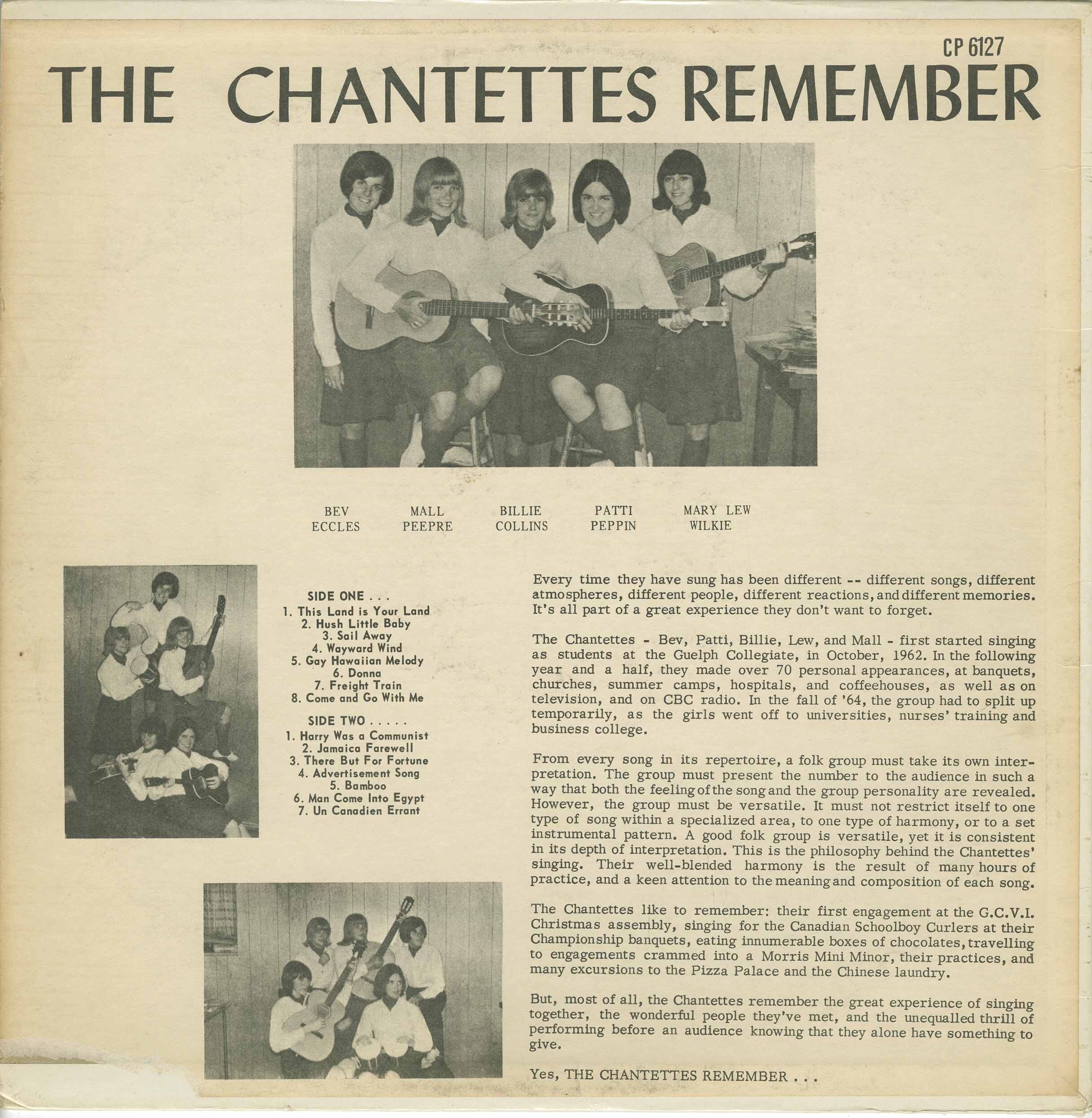 The Chantettes like to remember: their first engagement at the G.C.V.I. Christmas assembly, singing for the Canadian Schoolboy Curlers at their Championship banquets, eating innumerable boxes of chocolates, travelling to engagements crammed into a Morris Mini Minor, their practices, and many excursions to the Pizza Palace and the Chinese laundry.