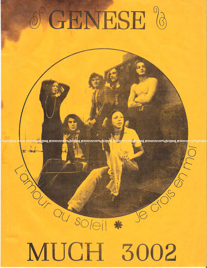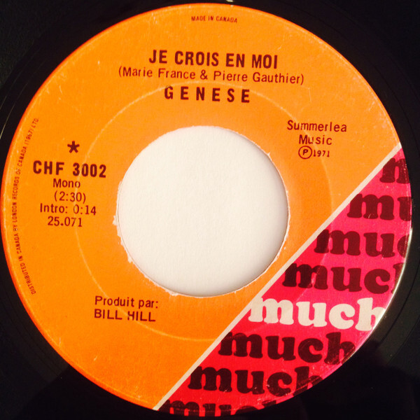 One hundred watts of progressive impulse, sharing their namesake with the British sextet, the hardrock Quebec version of Genèse published this intense single for the Much label under the tutelage of their house producer, guitarist Bill Hill (JB & the Playboys, Carnival Connection, Freedom North). The group relied upon the compositions of Pierre Gauthier and Marie-France Paquin, both future members of the band Eclipse. Following the rapid dissolution of Genèse, Gauthier joined the influential Aut'Chose for a few albums, recycling the riff from "Je crois en moi" in "Ambulance Francoeur". The track was recently compled on Freakout Total Vol 33 by Mucho Gusto.