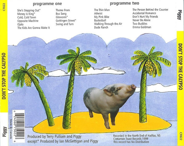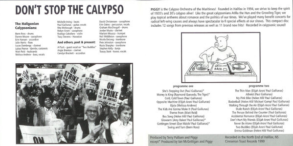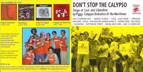 Fronted by the exuberant Paul Gailiunas, Halifax's Piggy have been enlightening the masses for over six years now and their first full-length CD is simply busting at the seams with good times. For a band that prides itself as veterans of the benefit circuit, fighting against social injustices, fun might not be what you'd expect. But then Piggy has always been about re-writing the rules. Another thing that might turn your head around is Piggy's connection to calypso music. Give the record a spin and listen to country and western guitar laments, Eastern European violin, Vaudeville show tunes, giddy pop songs, cool jazz and political folk ballads. Maybe it's not your conception of calypso, but to Piggy it's the subject matter of their topical anthems that maintain that calypso spirit. These socio-political tracks revel in tales of the everyday ranging from homelessness and public etiquette to bike riding, favourite neighbourhoods and even theology. Piggy songs never whine about the mess this world is in, they just try to make things better, starting with putting a great big gaping smile on your face.