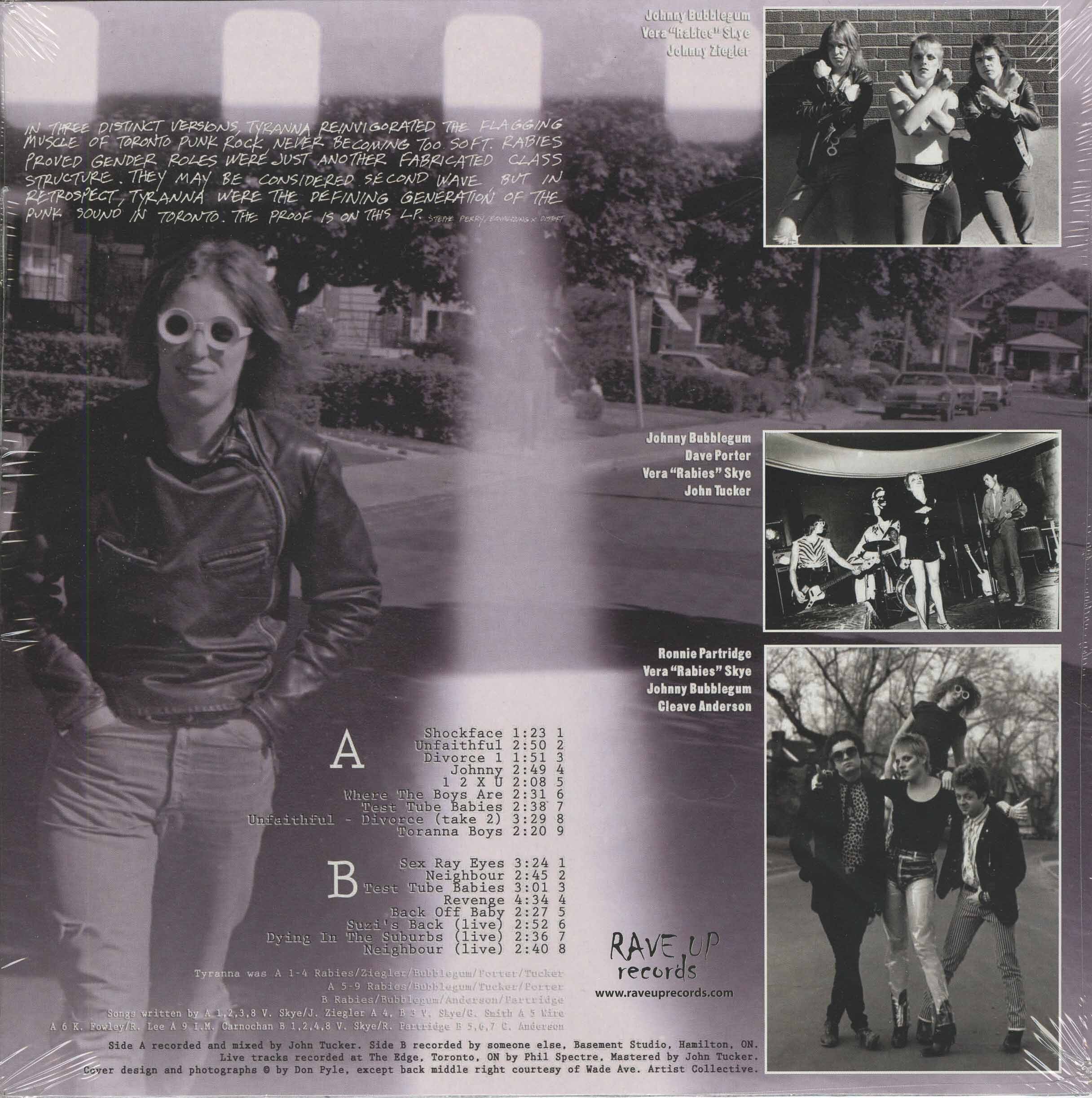 Tyranna’s best work wasn’t released on singles at the time, and they rarely ventured outside the city during their brief run in 1978 and 79. This explains why the energetic pop-punk crew led by the snarly Vera “Rabies” Skye, who split bills with Iggy Pop, Jane County, the Members and the Dils, isn’t better known today. The band also appeared on 'My Girlfriend Was a Punk' compilation with the track 'Back Off Baby'.