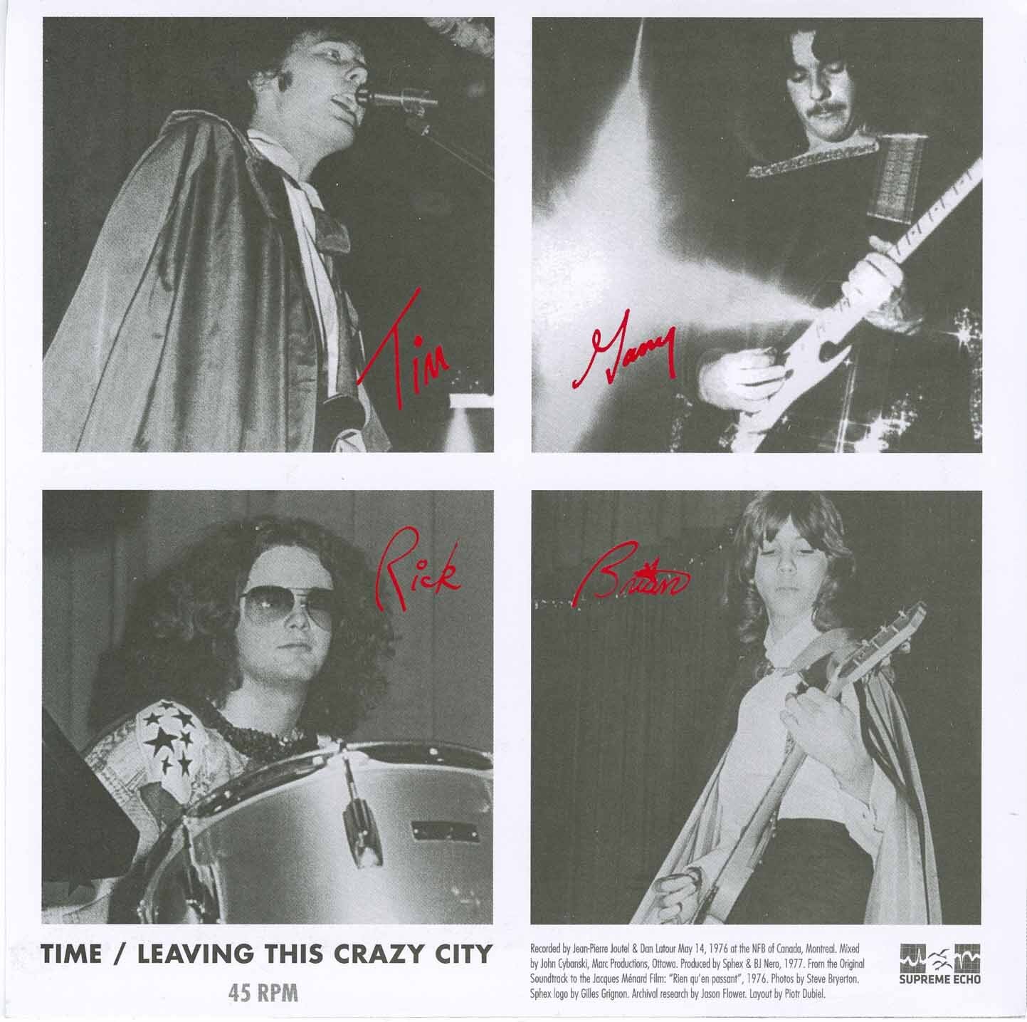 This Canadian teenage group from small-town Ontario had their own mature sound, predating punk and surpassing all older groups in the region. Recorded for a soundtrack at the Montreal National Film Board in 1976 and released nearly two years later, "Time" is a dynamic heavy rocker, whereas "Leaving This Crazy City" is a proto-punk surprise! Originally issued as a sleeveless gold labelled 45 in a very small edition, now reissued with repro labels, deluxe picture sleeve (not fold-over), and 16 page booklet with detailed history & tons of photos. For fans of the many other little known proto-punk hard rockers of the mid-70s. Fully authorized, limited edition of only 600 copies.