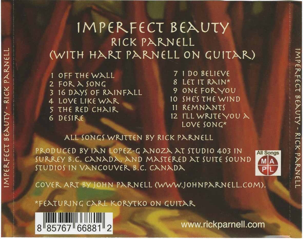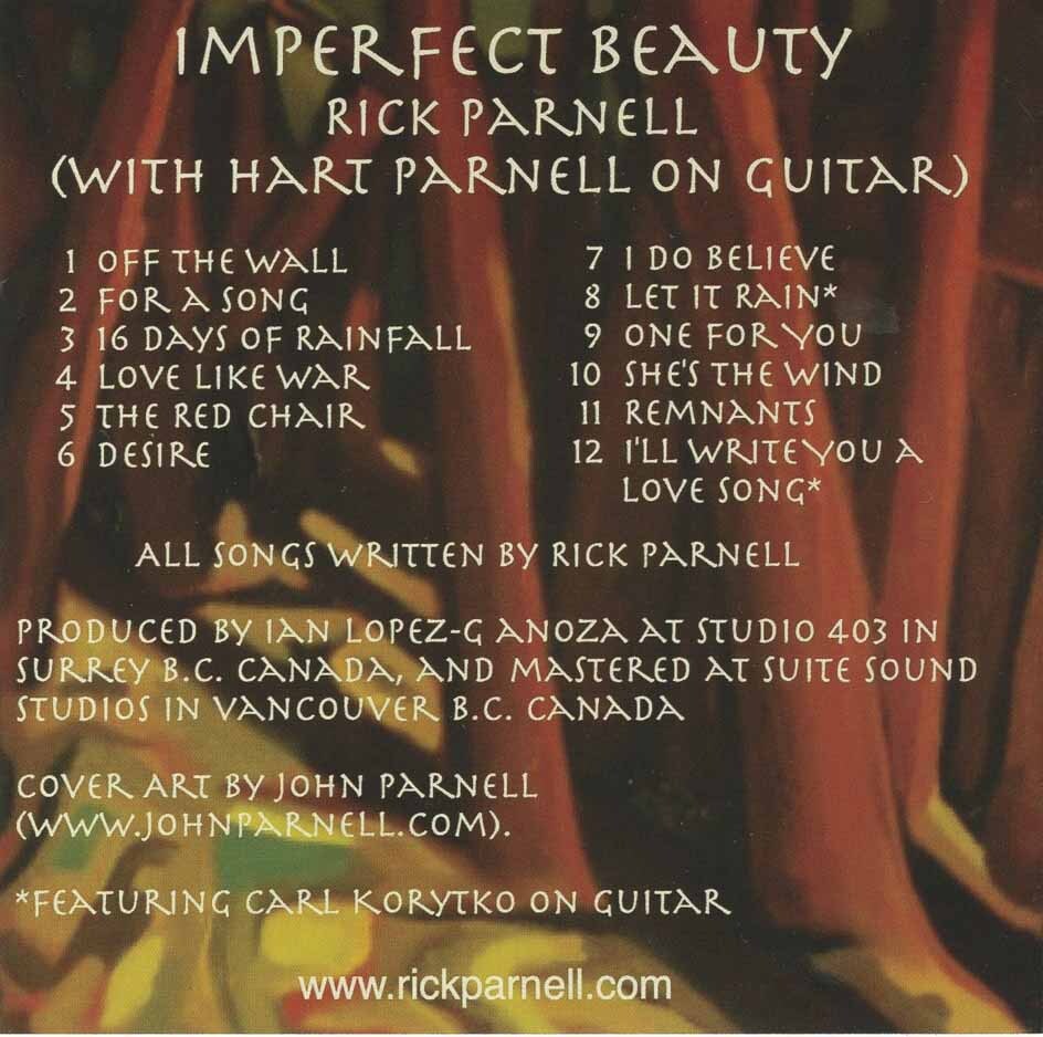 Rick Parnell releases his latest CD, “Imperfect Beauty,” featuring an excellent collection of Rock/Folk songs. Parnell and his fellow musicians create an album that is brimming with thought provoking lyrics and soulful melodies. The song, “For a Song (feat. Hart Parnell),” has laid back vocals that sing the interesting lyrics with emotive style. “Desire (feat. Hart Parnell),” has a smooth rhythmic groove that also features some great guitar riffs. The track, “One For You (feat. Hart Parnell),” has a Bluesy feel as the mellow vocals are complemented by solid drums and soulful guitar hooks. If you are into the musical likes of Bob Dylan or The Traveling Wilburys, then you will enjoy the terrific songs on the album, “Imperfect Beauty.” -Radioindy.com Captivating lyrics and word play, powerful guitar hooks and weaves, and a blend of folk, classic rock and blues define this twelve-song disc. The style is fresh while reminiscent of classic rock songs from the 60‘s, 70’s and 80’s. These songs continue a trend toward timeless classics suited to music lovers of every generation. As with his debut EP One Eye Open released in 2009, Rick Parnell’s songwriting delivers unique character and flavour. With this full length disc, Parnell focuses more attention on production, using studio musicianship to explore and expand the overall sound. The recordings on this collection mark the debut of Hart Parnell on lead guitar - Rick’s youngest son is a dream guitarist “built from scratch.” buy the album here: http://www.cdbaby.com/Artist/RickParnell