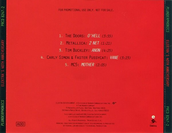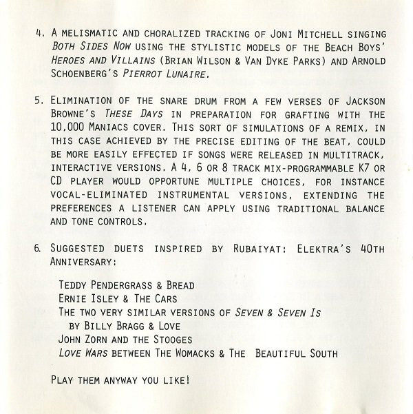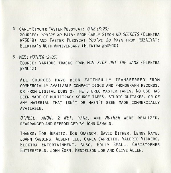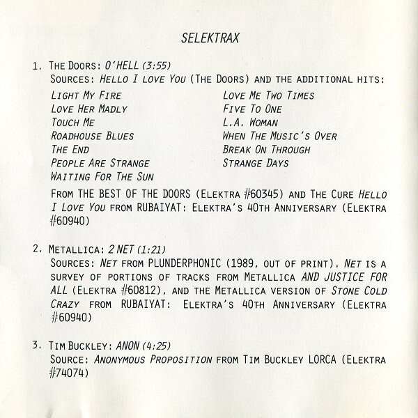 To prove they were truly hip, Elektra commissioned Oswald to plunder artists on their label for a special anniversary EP they planned to release as part of the RubƔiyƔt package (Oswald prefers the title "Elektrax"). Unfortunately Elektra failed to obtain permission from the Morrison estate for use of Doors material and also failed to inform Metallica of their involvement (although, reportedly, the band thought it was "cool"). The result: it was distributed only to DJs and radio stations and is now almost impossible to find.
