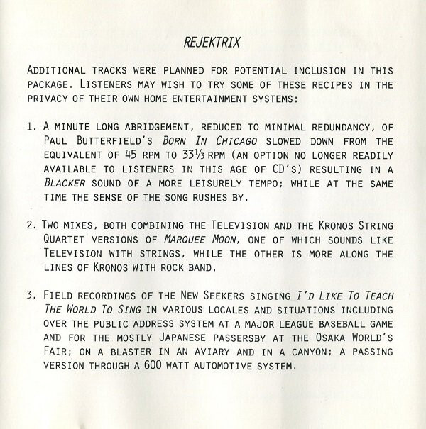 thanks: David Bither, Bob Krasnow, Bob Hurwitz, Lenny Kaye, Albert Lee, JoAnn Kaeding, Carla Capietto & Valerie Vickers at Elektra/Nonesuch/Asylum. also: Holly Small, Christopher Butterfield, Bob Wiseman, Mendelson Joe, Clive Allen & John Zorn.