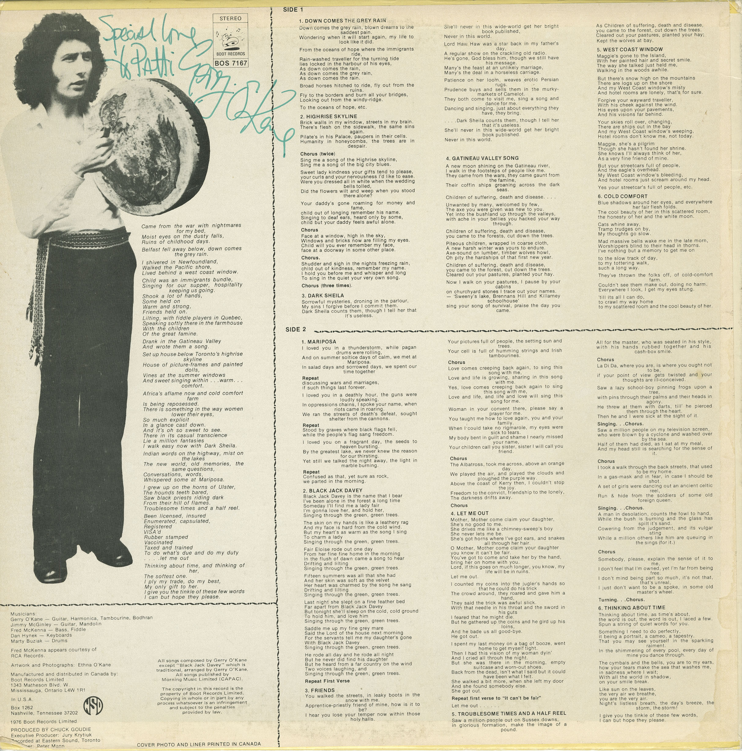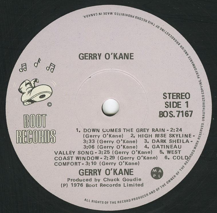 In 1976, O’Kane released his self-titled debut LP on Boot Records (BOS 7167), produced by Chuck Goudie and engineered by Peter Mann at Eastern Sound, Toronto. The album featured a seasoned studio lineup including Jimmy McGinley (guitar, mandolin), Fred McKenna (bass, fiddle), Dan Hynek (keyboards), and Marty Buziak (drums), with artwork and photography by Ethna O’Kane. A mix of original compositions and traditional material, the record balanced introspective songwriting (“Down Comes the Grey Rain,” “Gatineau Valley Song”) with Irish folk influences, most notably his arrangement of the traditional “Black Jack Davey.”