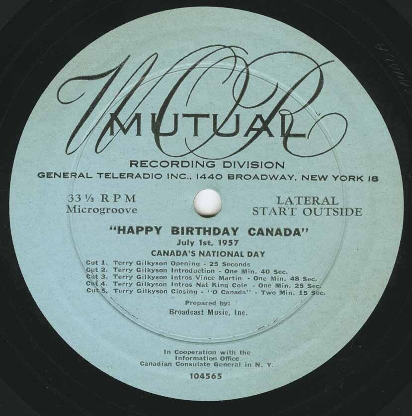 single sided American tribute to their northerly neighbour with intros of american music by famous American artists of the day including Vince Martin, Nat King Cole, and moderated by Terry Gilkyson. Recording was made possible in cooperation with the Information Office Canadian Consulate General in N.Y. "Happy Birthday Canada" etched in the dead wax.