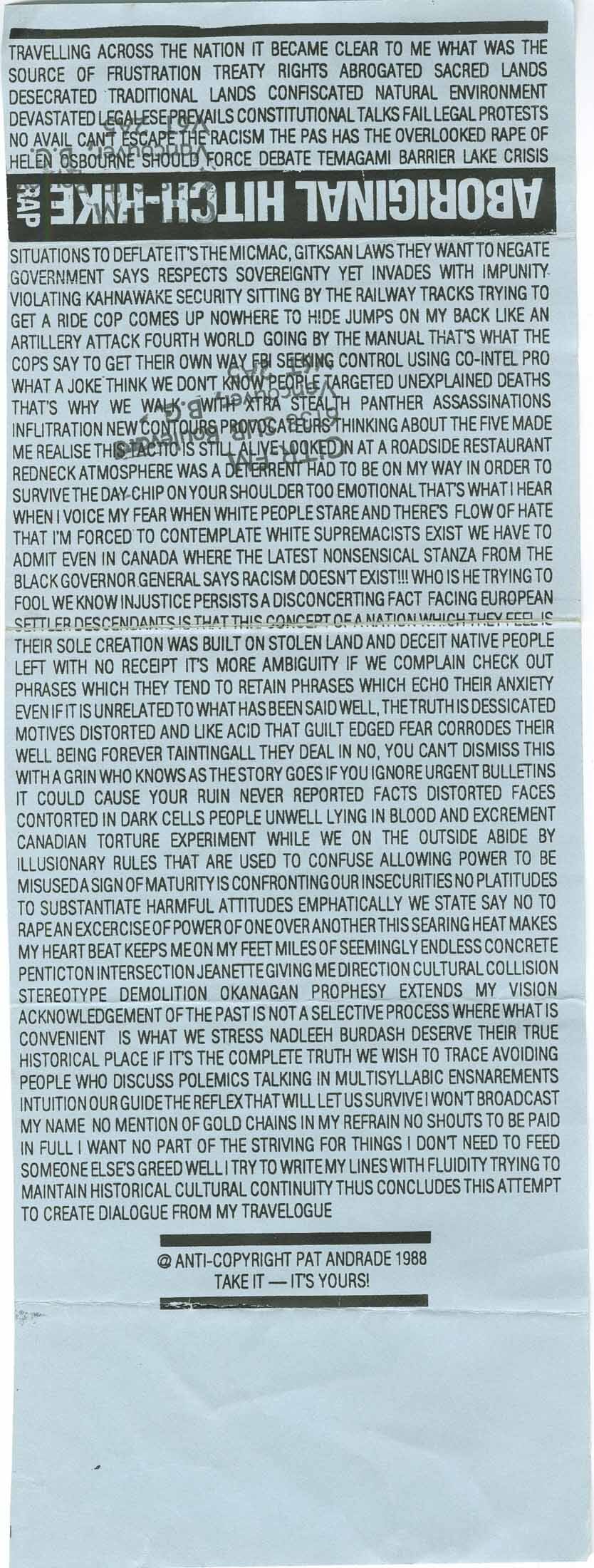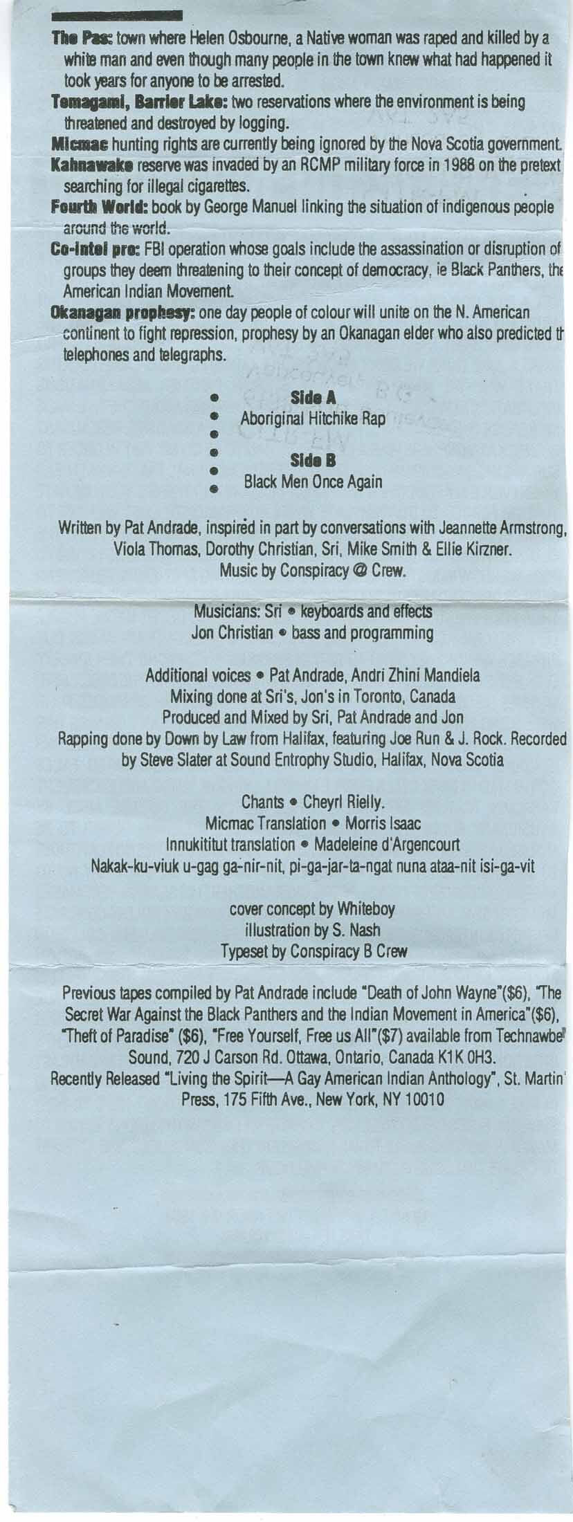 Written by Pat Andrade, inspired in part by conversations with Jeannette Armstrong, Viola Thomas, Dorothy Christian, Sri, Mike Smith & Ellie Kirzner.