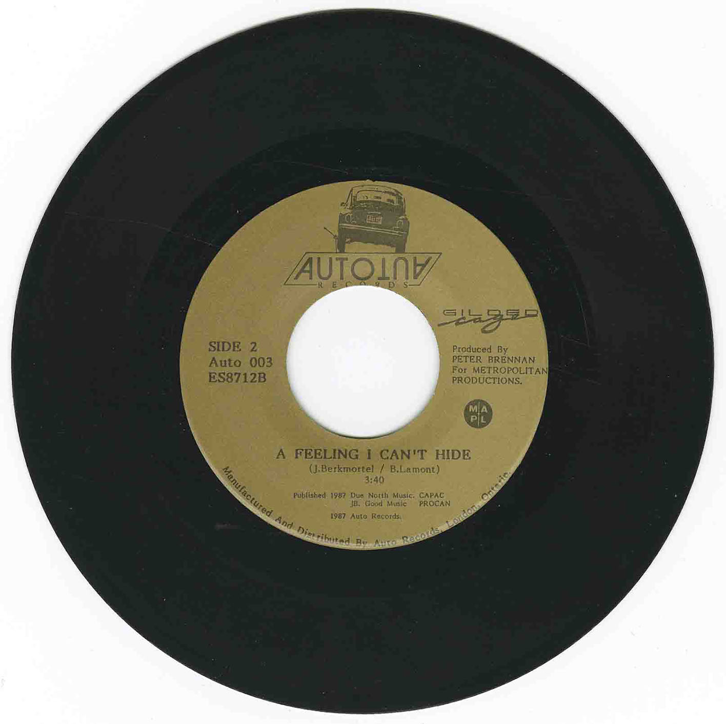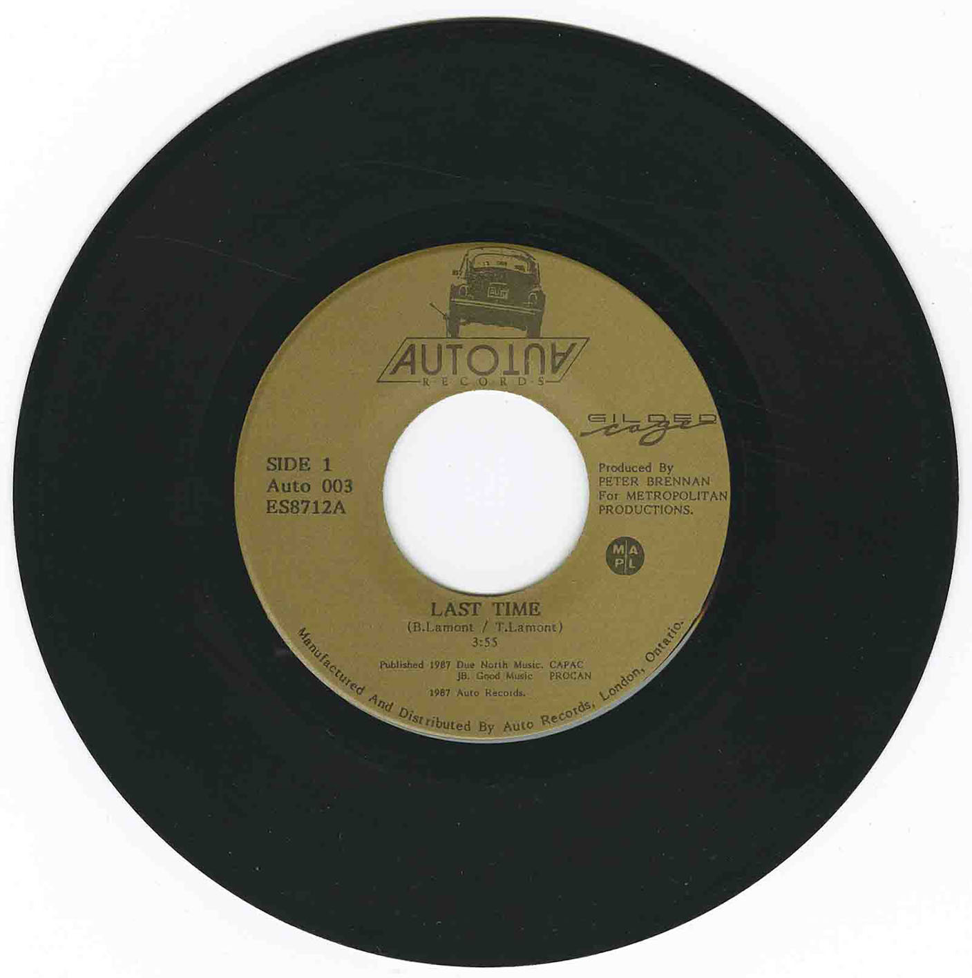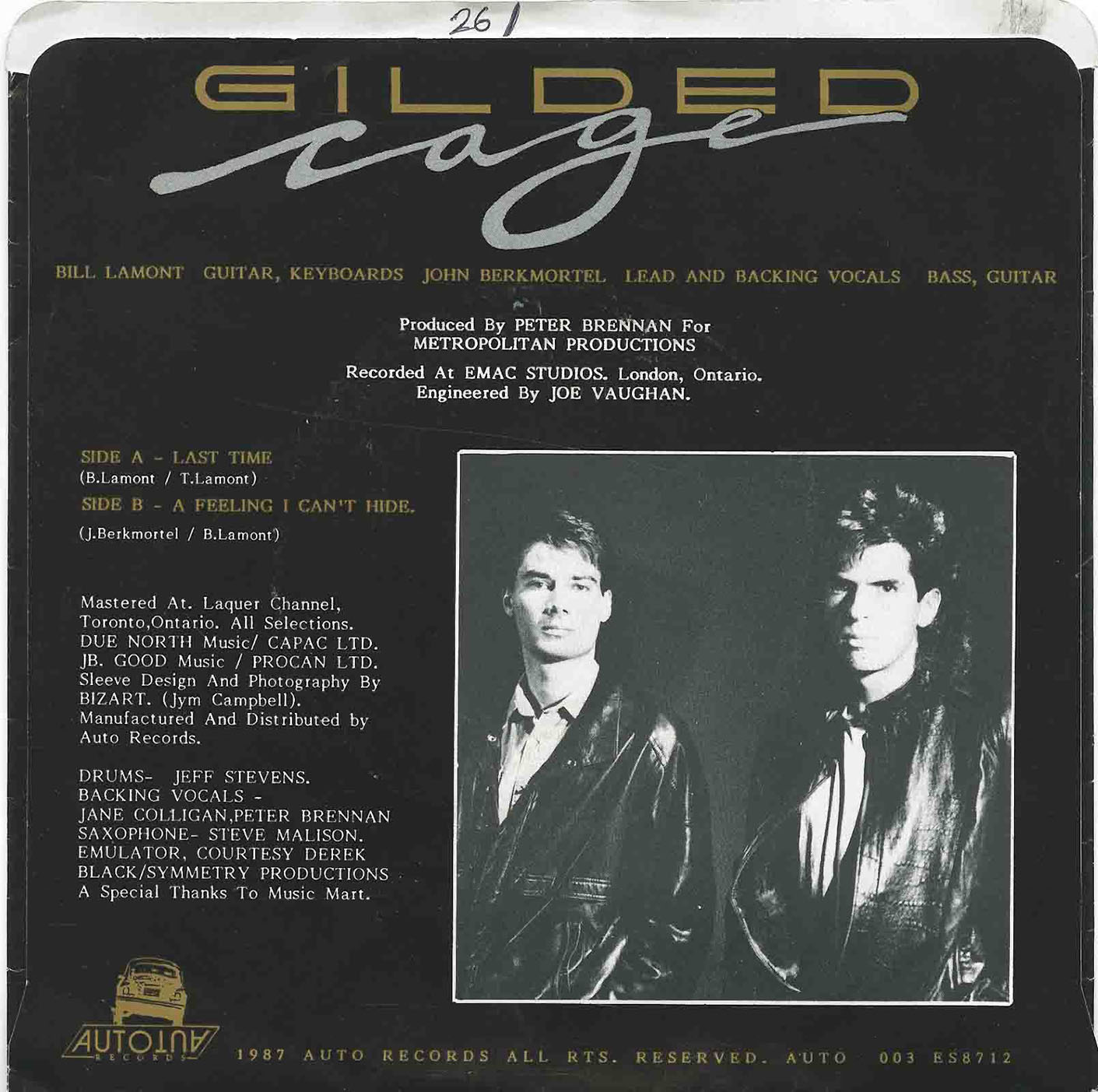 Their debut single, ‘Last Time’ b/w ‘A Feeling I Can’t Hide’ (Auto Records AUTO 003, 1987), was recorded at EMAC Studios in London and produced by Peter Brennan. The release showcased a polished, radio-ready rock sound supported by session musicians and careful production. The single received strong airplay locally and regionally, won CFPL-FM’s On Track competition, and performed well on CKSL’s Battle of the Bands, where it won multiple nights. Approximately 1,000 copies were pressed and distributed through Auto Records and local retailers including Sam the Record Man, establishing Gilded Cage as a serious studio-based act and validating their non-traditional approach.