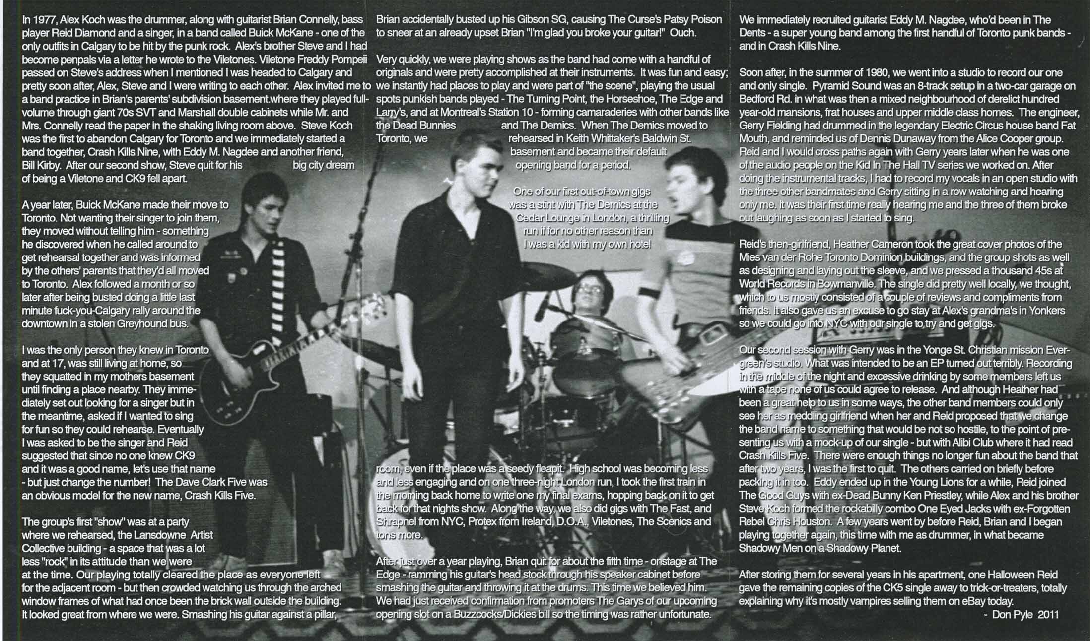 These guys (Crash Kills Five) sounded very punk rock and were strongly compared to the Ramones and even Teenage Head. Some members went onto become Shadowy Men On A Shadowy Planet which was a more garage and surf type sound. All of the group members were excellent musicians and Shadowy Men were made famous when they did the music for the excellent Canadian comedy 'Kids in the Hall.' We in Western Canada still miss Reid Diamond who left us back in 2001. Just like Frankie Venom of Teenage Head both guys entertained us very much back in the days. Reid was a super guy and will always remembered.