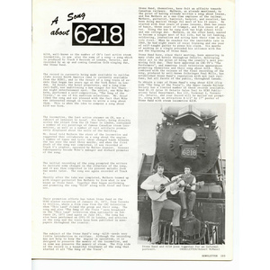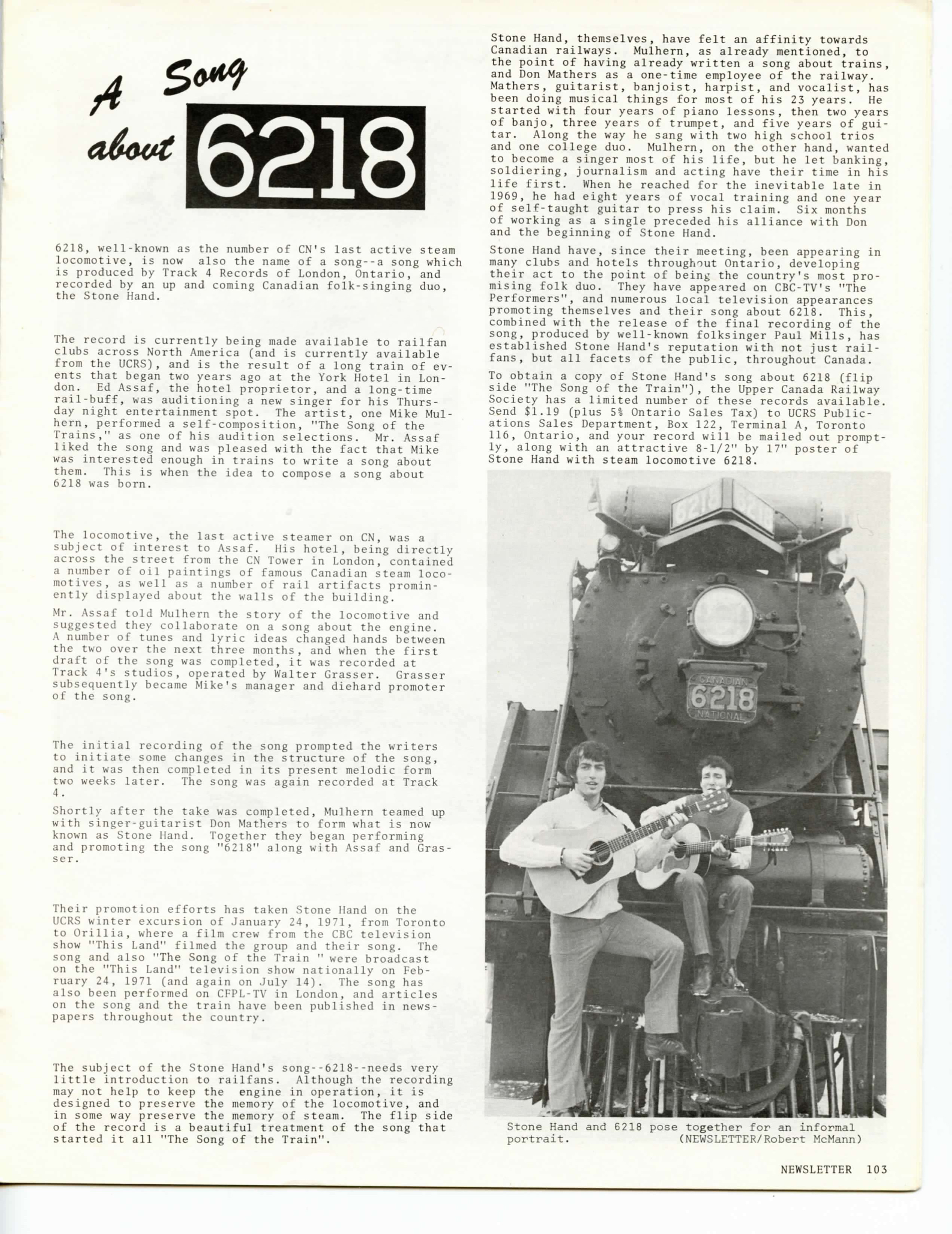 6218, well-known as the number of CN's last active steam locomotives, now also the name of a song - a song which is produced by Track 4 Records of London, Ontario, and recorded by an up-and-coming Canadian folk-singing duo, the Stone Hand. The record is currently being made available to railfan clubs across North America (and is currently available from the UCRS) and is the result of a long train of events that began two years ago at the York Hotel in London. Ed Assaf, the hotel proprietor, and a long-time rail-buff, was auditioning a new singer for his Thursday night entertainment spot. The artist, one Mike Mulhern, performed a self-composition, "The Song of the Trains, " as one of his audition selections. Mr. Assaf liked the song and was pleased with the fact that Mike was interested enough in trains to write a song about them. This is when the idea to compose a song about 6218 was born.
