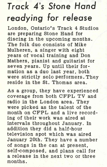 Stone Hand, themselves, have felt an affinity towards Canadian railways. Mulhern, as already mentioned, to the point of having already written a song about trains, and Don Mather s as a one-time employee of the railway. Mathers - guitarist, banjoist, harpist, and vocalist, has been doing musical things for most of his 23 years. He started with four years of pian o lessons, then two years of banjo, three years of trumpet, and five years of guitar. Along the way he sang with two high school trio s and one college duo. Mulhern, on the other hand, wanted to become a singer most of his life, but he let banking, soldiering, journalism and acting have their time in his life first. When he reached for the inevitable late i n 1969, he had eight years of vocal training and one year of self-taught guitar to press his claim. Si x months of working as a single precede d his alliance with Don and the beginning of Stone Hand. Stone Hand have, since their meeting, been appearing in many clubs and hotel s throughout Ontario, developing their act to the point of being the country' s most promising folk duo. They have appeared on CBC-TV's "The Performers", and numerous local television appearances promoting themselves and their song about 6218. This, combined with the release of the final recording of the song, produce d by well-known folksinger Pau l Mills, has established Stone Hand's reputation with not just rail - fans, but al l facet s o f the public, throughout Canada. To obtain a copy of Stone Hand's song about 6218 (flipside "The Song of the Train"), the Upper Canada Railway Society has a limited number of these records available. Send $1.19 (plus 58 Ontario Sales Tax) to UCRS Publications Sales Department, Box 122, Termina l A, Toronto 116, Ontario, and you r record will be mailed out promptly, along with an attractive 8-1/2" by 17" poster of Stone Hand with steam locomotive 6218.