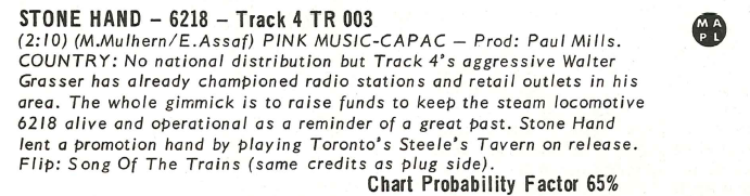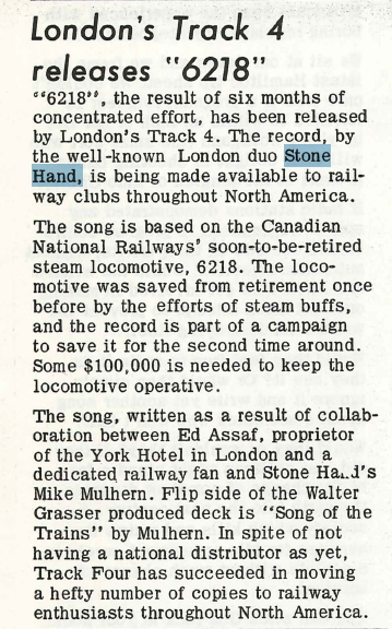 The locomotive, the last active steamer on CN, was a subject of interest to Assaf. His hotel, being directly across the street from the CN Tower in London, contained a number of oil paintings of famous Canadian steam locomotives, as well as a number of rail artifacts prominently displayed about the wall s o f the building. Mr. Assaf told Mulhern the story of the locomotive and suggested they collaborate on a song about the engine. A number of tunes and lyric ideas changed hands between the two over the next three months, and when the first draft of the song was completed, it was recorded at Track 4's studios, operated by Walter Crasser. Crasser subsequently became Mike' s manager and diehard promoter of the song. The initial recording of the song prompted the writers to initiate some changes in the structure of the song, and it was then completed in its present melodic form two weeks later. The song was again recorded at Track 4. Shortly after the take was completed, Mulhern teamed up with singer-guitarist Don Mathers to form what is now known as Stone Hand. Together they began performing and promoting the song "6218" along with Assaf and Crasser. Their promotion efforts have taken Stone Hand on the UCRS winter excursion of January 24, 1971, from Toronto to Orillia, where a film crew from the CBC television show "This Land" filmed the group and their song. The song and also "The Song of the Train " were broadcast on the "This Land" television show nationally on February 24, 1971 (and again on July 14). The song has also been performed on CFPL-TV in London, and article s on the song and the train have been published in newspapers throughout the country. The subject of the Stone Hand's song “6218” needs very little introduction to railfans. Although the recording may not help to keep the engine in operation, it is designed to preserve the memory of the locomotive, and in some way preserve the memory of steam. The flipside of the record is a beautiful treatment of the song that started it all "The Song of the Train".