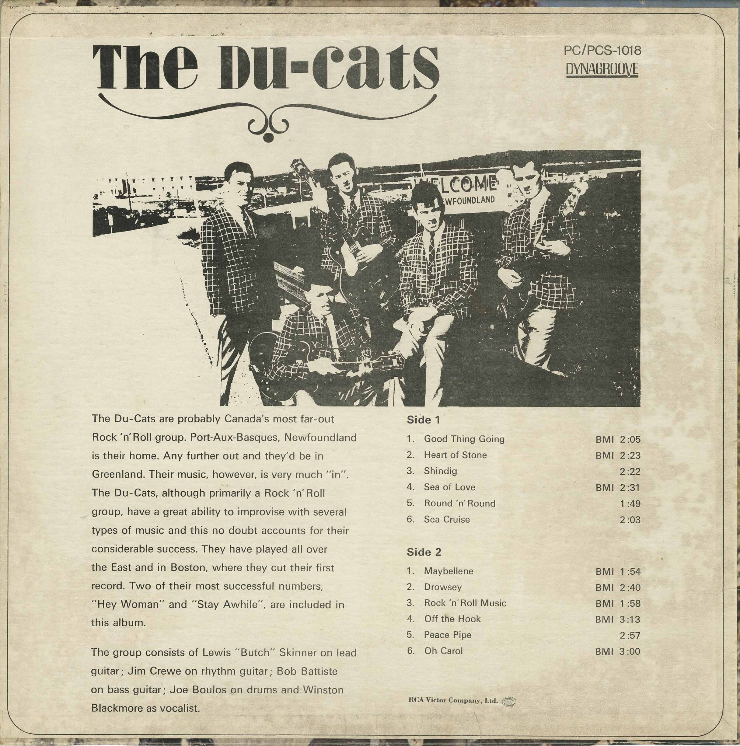 The Du-Cats consisted of Lewis "Butch" Skinner on lead guitar; Jim Crewe on rhythm guitar; Bob Battiste on bass guitar; and Joe Boulos on drums; and Winston Blackmore as vocalist. This is a different Winston Blackmore than the polygamist Winston Blackmore who fathered over one hundred children with 25 different wives. It is not known how many children the Newfie Winston fathered.