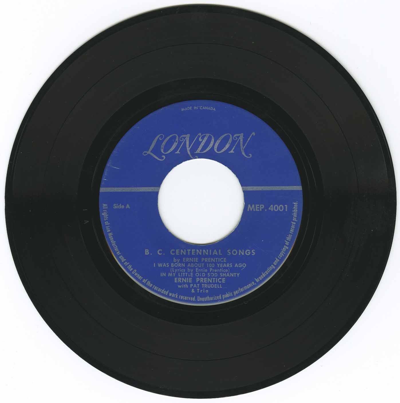 Ernie Prentice with Pat Trudell & Trio / I Was Born About 100 Years Ago/ In My Little Old Sod Shanty b/w The Old Settler’s Song/ When The Ice Worms Nest Again (picture sleeve)
