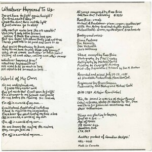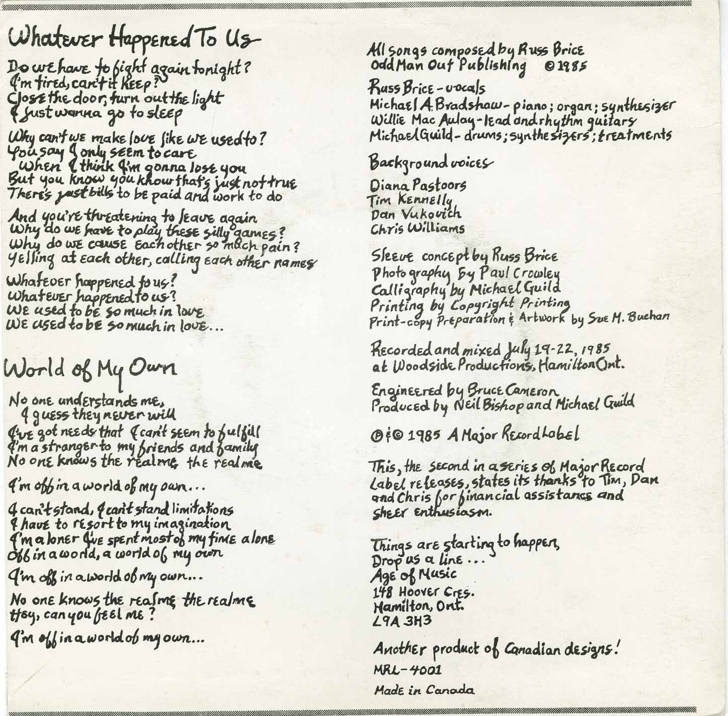 Recorded and mixed July 19-22, 1985 at Woodside Productions, Hamilton, Ontario