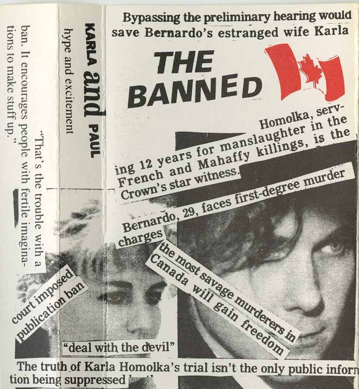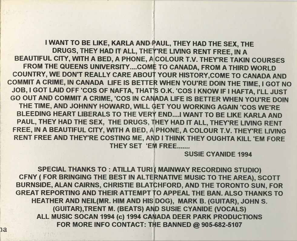 The tape is produced by St. Catharines-based Deer Park Productions (905-682-5107). Producer John Spenser and the band were very visible at the opening salvo of Bernardo's trial, flogging the tape at $4 a pop. The group considered singing the songs outside the courthouse but decided this would be in "bad taste." The tape is available on consignment in various shops in Toronto, like Vortex on Queen W.