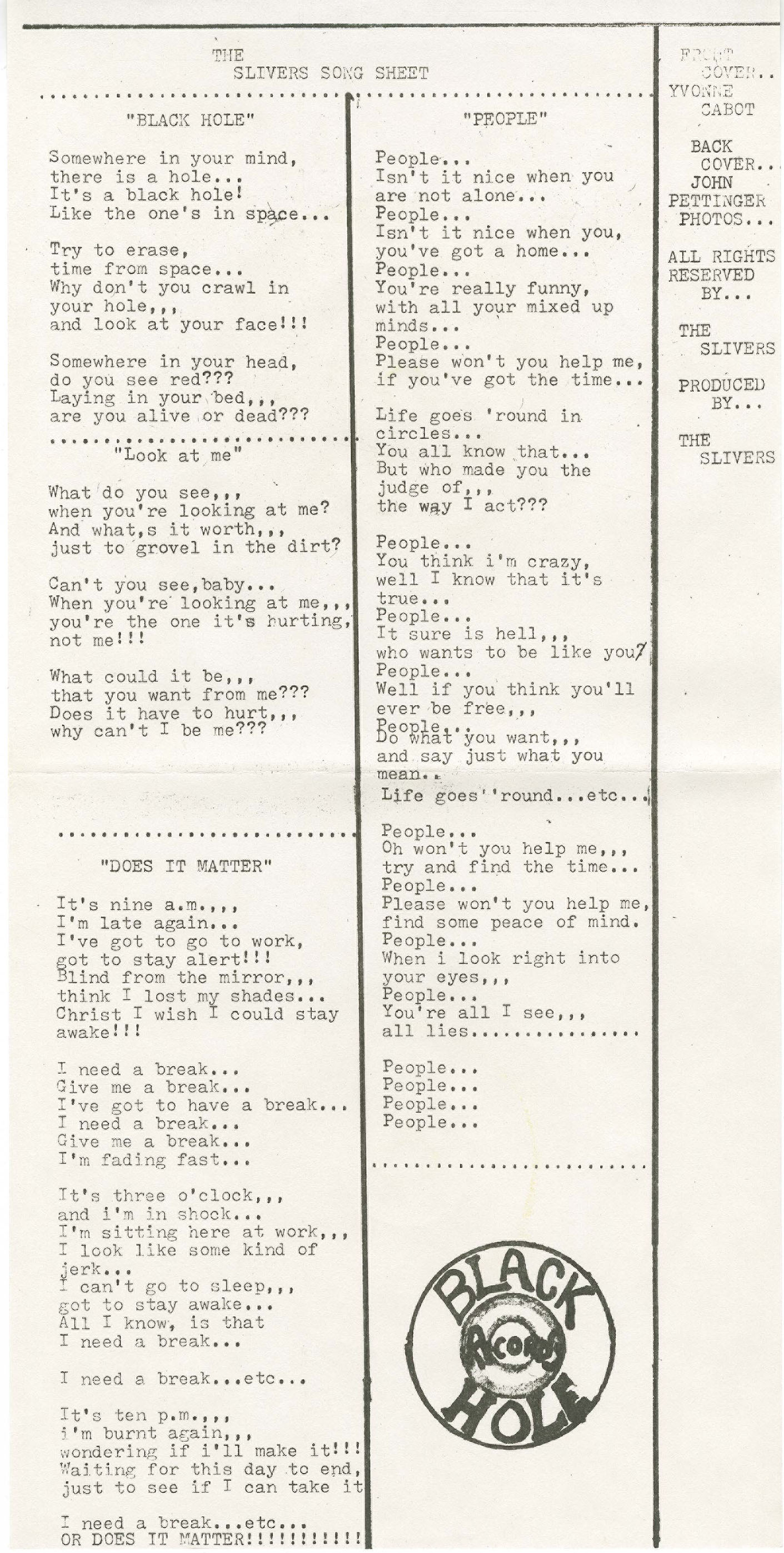 "Black Hole" is a fast-tempo melodic punk/mod rocker with velvet-smooth lead vocals from Yvonne Cabot, good backing vocals from Murry Pettinger and nice guitar work including a good solo, percolating bass, and good time-keeping from kathy Westwood.