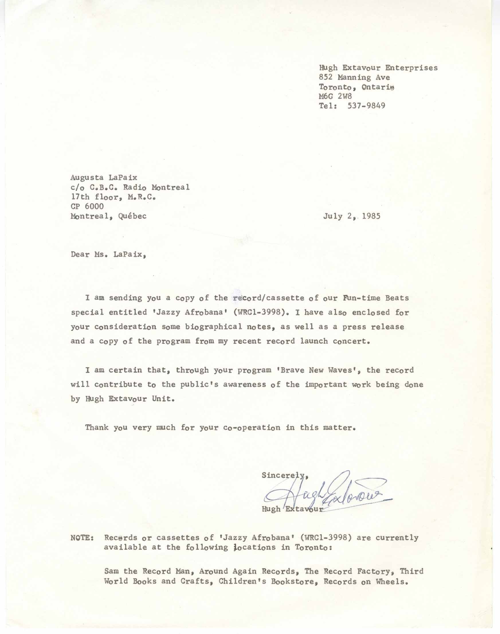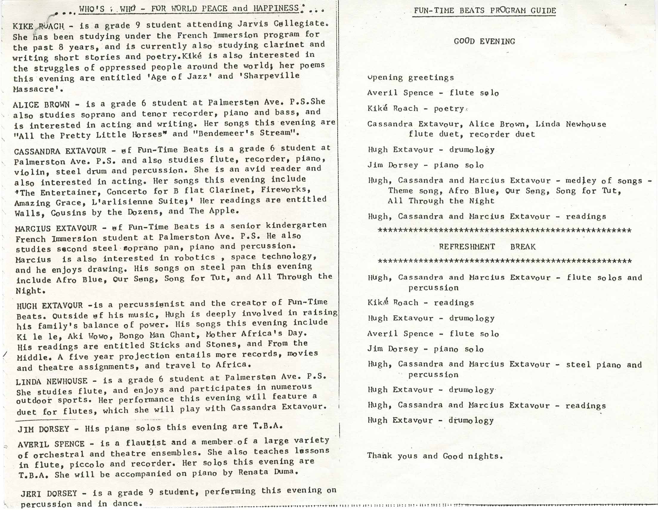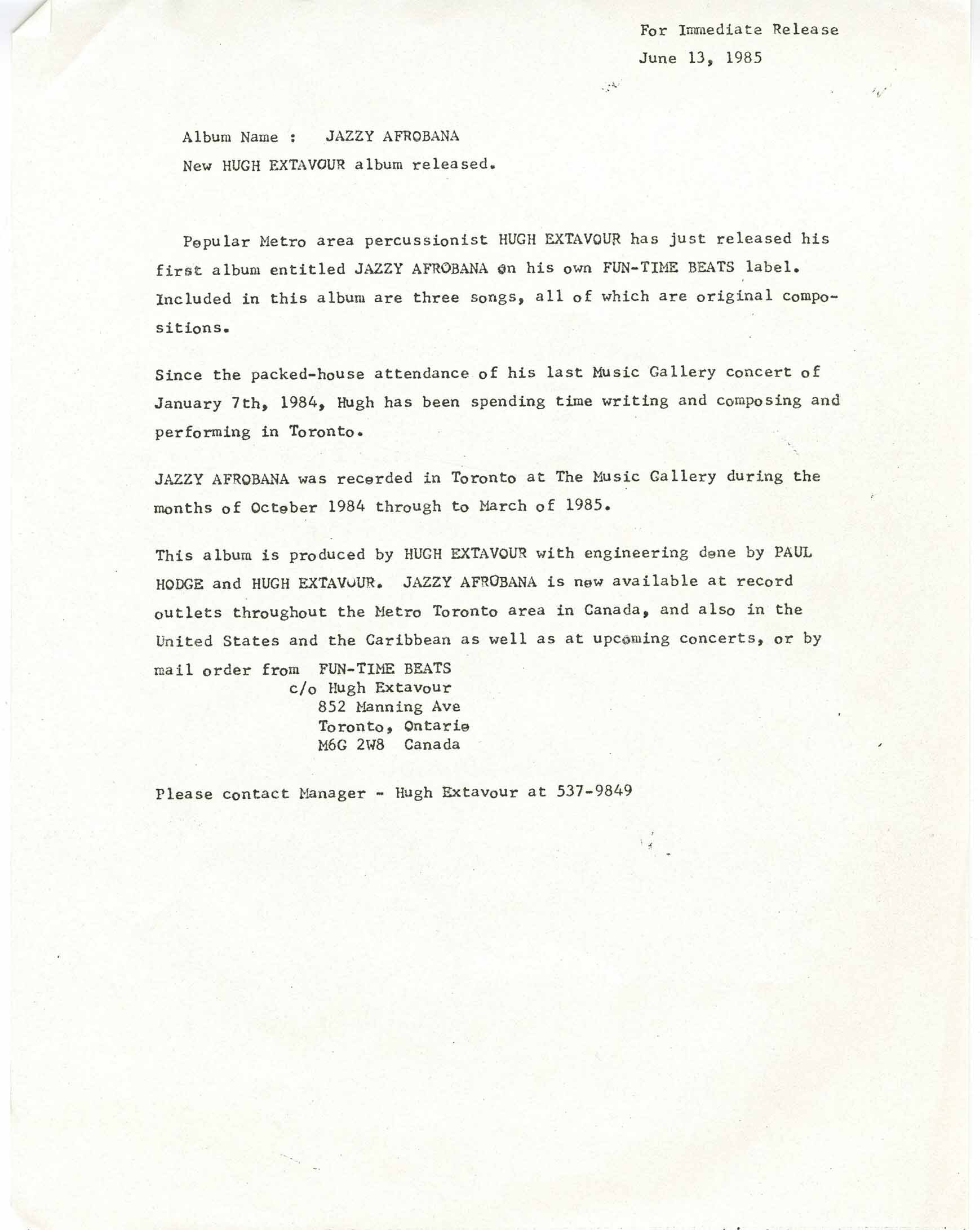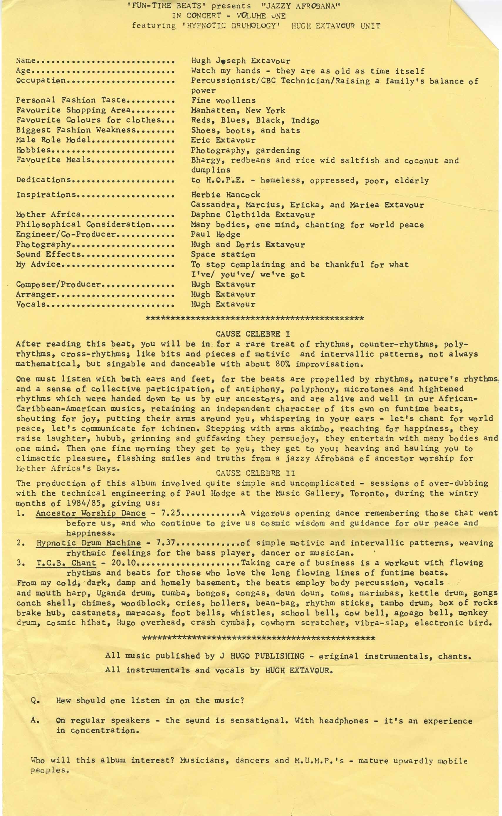 Hughgo (Hugh) Joseph Extavour passed away in his 78th year in his Toronto home on October 18, 2017. Born on April 12, 1940 in Port of Spain, Trinidad & Tobago, third child of Daphne Patience Clothilda Extavour and Eric Conrad Extavour, he came to Canada in 1967 and extended the Extavour name into this country. Founding member of Martinsday, Caribana, Afropan, King Friends International and countless other community upliftment activities; musician, drummer, philosopher, social entrepreneur and artist. He spent 30 years at the CBC as a broadcasting technician.