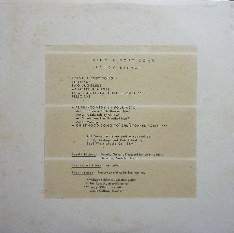 Randy Bishop: vocals, guitars, keyboard instruments, bass, recorded, marimba, banjo