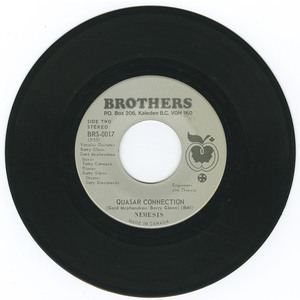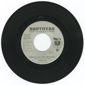 In 1973, Nemesis entered the studio to record two original tracks: “Dreams Are For Dreamers” (written by McPhedran), and the slightly more progressive “Quasar Connection” (co-written by McPhedran and Glenn). Both songs capture the warm, melodic tendencies of early '70s soft psych, blending acoustic textures, lush harmonies, and cosmic lyrical imagery. The single was issued on the private Brothers label (BRS-0017), engineered by Jim Thievin, and distributed locally in small quantities, making surviving copies highly sought after today by collectors of rare Canadian rock. Estimated value for clean originals now approaches $150.