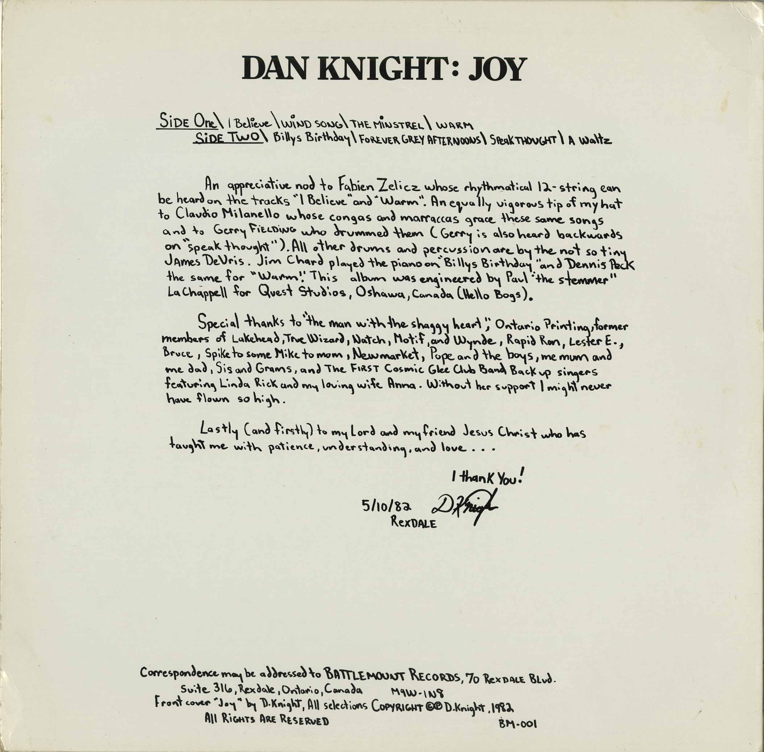 An appreciative nod to Fabien Zelicz whose rhythmatical 12 string can be heard on the tracks "I Believe" and "Warm". An equally vigorous tip of my hat to Claudio Milanello whose congas and marraccas grace these same songs and to Gerry Fielding who drummed them (Gerry is also heard backwards on "Speakthought"). All other drums and perscussion are by the not so tiny James Devris. Jim Chard played the piano on "Billys Birthday" and Dennis Peck the same for "Warm". This album was engineered by Paul "The Stemmer" LaChappell for Quest Studios, Oshawa, Ontario (Hello Bogs). Assistant supervision by James G. McDonough.