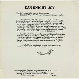 oy is publisher and songwriter Dan Knight’s sole LP, released on his own Battlemount Records in 1982. Skip Prokop of Lighthouse offered to produce a follow up, but he'd already started down the road to becoming a small press, primarily publishing SF luminary R.A. Lafferty’s fugitive stories on his United Mythologies imprint. The album is an exercise in folk world-building, counter-balancing Lafferty’s dystopian themes with earthy optimism.